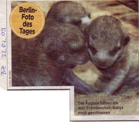 @Spreewald-Marion, ich wäre heute auch gerne in den Zoo gekommen, es klappte diesen Mittwoch nicht. Dass Du die kleinen Erdhörnchen gesehen hast, finde ich super. Bereits am Sonntag war das "Foto des Tages" in der BZ den kleinen drei Neugeborenen gewidmet: