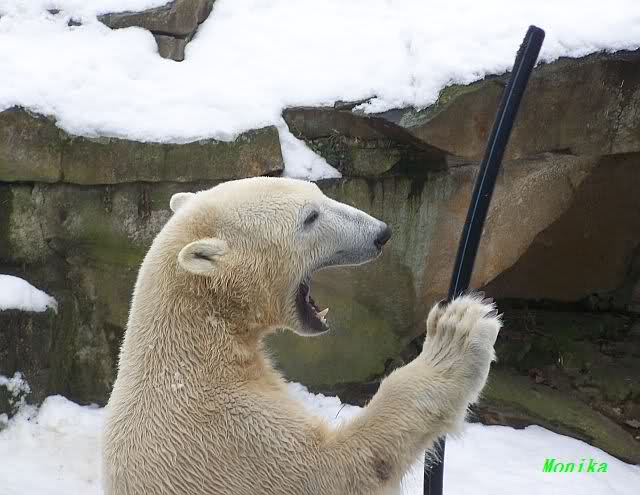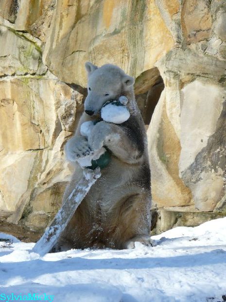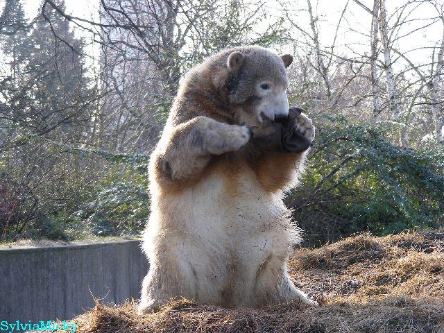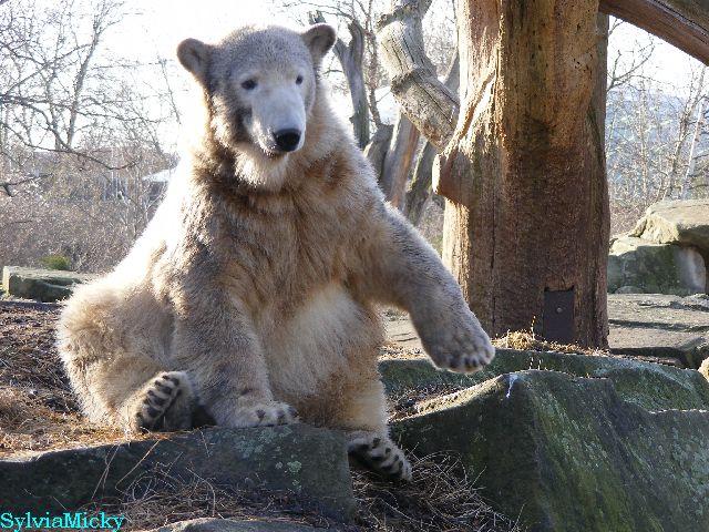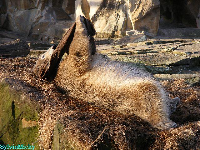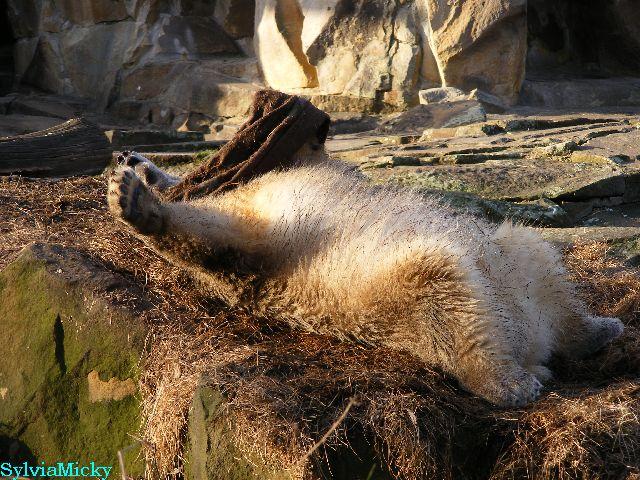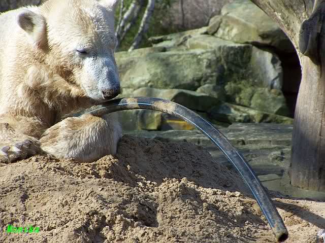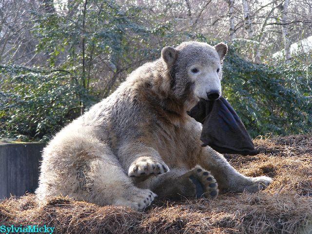 Dieses liebe ich auch. Knut war so müde und schaute zu als vor seinem Gehege Tische aufgebaut wurden. Als sich ein paar Minuten nichts tat, schlief er im Sitzen ein. Als er ein Geräusch hörte, riss er die Augen sofort weit auf. Eben Knut, der einfach nicht einschlafen wollte wenn etwas los war.