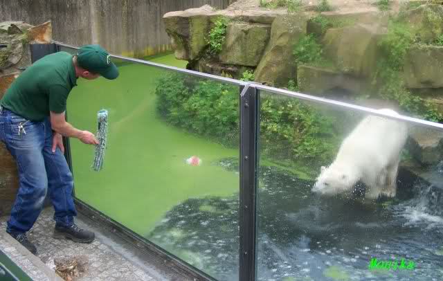 Knut und der "Scheiben-Putzer". Knut war immer sehr interessiert, was so an seinem Gehege passiert. So auch als der junge Pfleger die Scheiben putzte. Auch der Pfleger hatte seinen Spaß.