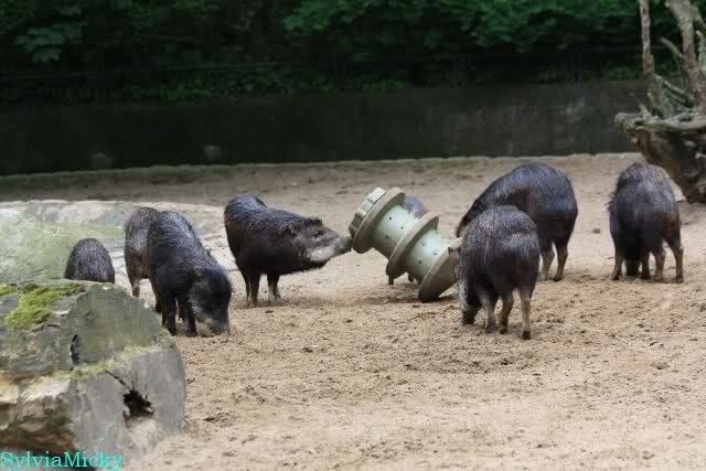 Die Pekaris kippten die Tonne um, so daß das Futter aus den Löchern raus kam und sie es fressen konnten