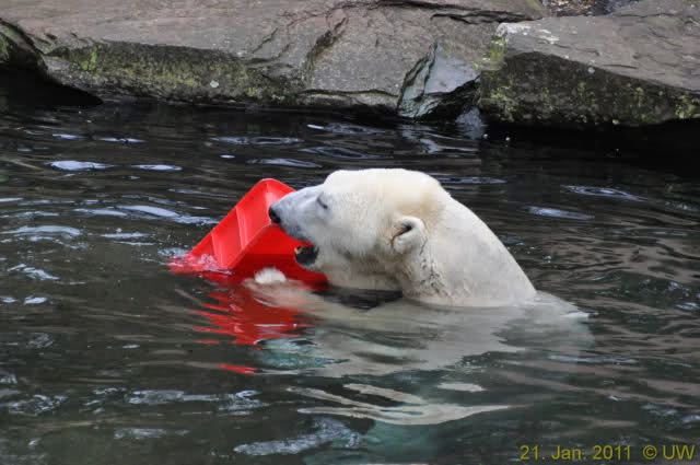 Auf der folgenden Bilderserie kann man schön sehen, wie schnell ein müder, gelangweilt schauender und gähnender Eisbär munter wird, wenn er ein paar Spielzeuge bekommt