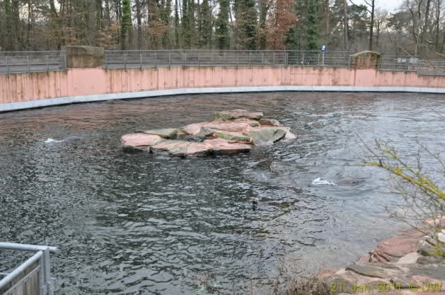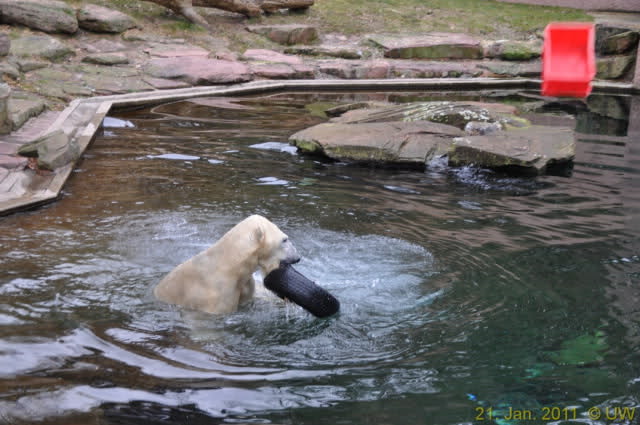 Kurz darauf kam die Tierpflegerin und warf einen Reifen und eine Kiste ins Wasser.