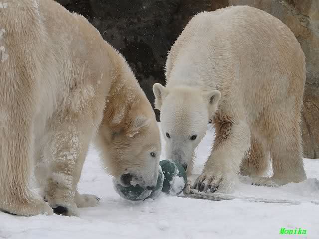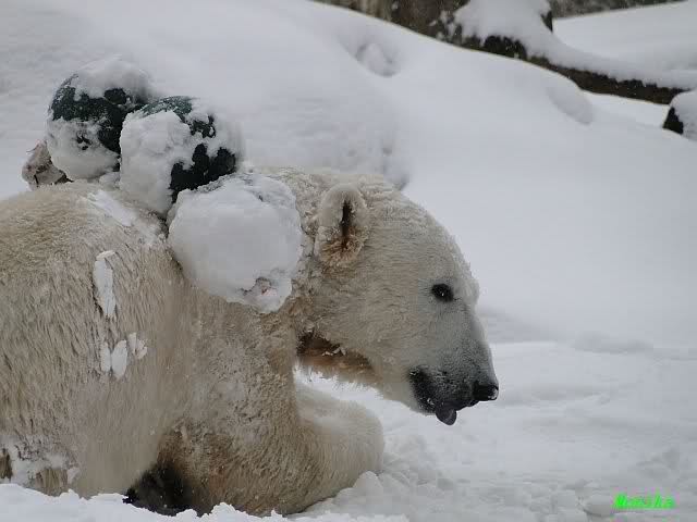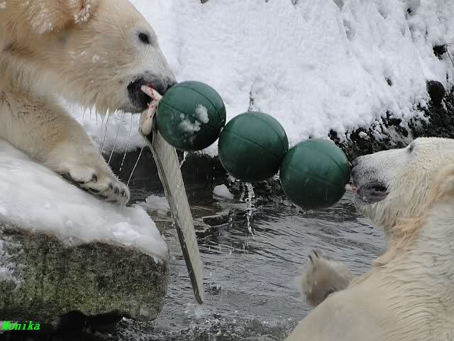 Well, Doris, you have a great style. Thanking the door keepers by making a grand reverence must be certainly appreciated (although I hope that your knee is not hurting). Most probably, next time when you visit Zoo Berlin, you can get a free entrance (however, I think that you have an annual ticket, well … too bad). But nonetheless, I have to disagree with you, once more, I am afraid. Although you promised Mervi a place in the third row or so, I think that you have taken the wrong decision. We all know by now how much you adore Knuti’s beard and so (ARHEEMMMM) and as such, you must be grateful that at least she gave him a moustache. But, HALLOOOOHHOOO, she put that moustache on top of his snout instead of under his nose. And therefore, NO place in the third row, but somewhere in the tenth of eleventh one!!! I have already planned to have a serious word with this lady when I am in Berlin.