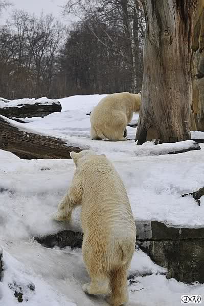 Schön war es bei Knut und Gianna. Bei unserer Ankunft spielte Knut im Wasser. Er hatte die letzten Futterreste eingesammelt und wartete auf Gianna. Sie kam auch hinunter zu ihm, ein kurzer Blick in den Graben – nichts da. Sie checkte, ob er noch etwas in der Schnauze hatte. Auch nichts. Also neckten sie sich eine Weile, er im Wasser, sie oben. Er versuchte sie ins Wasser zu bekommen. Sie hatte offensichtlich keine Lust. Erst sah sie nach, wie seine Junggesellbude aussieht, dann verschwand sie in zwei Sprüngen nach oben und drehte der Fernseher an. Es gab heute Kragi-TV. Knut planschte weiter im Wasser, wahrscheinlich hoffend, dass sie wiederkäme. Nichts da. Nachdem er noch ein bisschen mit den Eisschollen spielte, erklomm auch er den glatten Hügel. Ging zu Gianna, aber sie war nicht sonderlich interessiert. Daraufhin hatten wir dann zwei Eis-Lippenbären. Er machte eine Lippe weil sie nicht spielen wollte und sie, weil er sie immer wieder störte. Immer wenn sie sich wegdrehte, machte er Scheinangriffe in ihre Richtung, drehte sich dann zu den Besuchern als wollte er sehen, wie es ankam. Letztlich gab er auf und vergnügte sich allein. Allerdings ging der Blick immer wieder zu ihr. Witzig die Beiden.