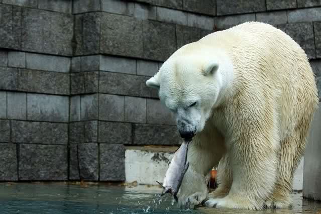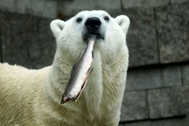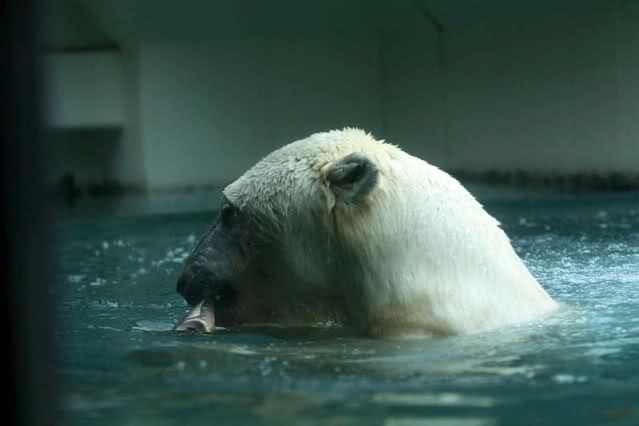 Nach der Seelöwenfütterung kam Lars’ Betreuer wieder zu uns und fütterte in aller Ruhe zuerst Jerka mit einem Lachs und anschließend liebevoll „seinen Großen“. Eine private Eisbärenfütterung - na, das war natürlich großartig. Zwischendurch erzählte er, wie sehr Lars das tiefe Wasser liebt und es genießt, darin zu tauchen und zu spielen. Lars sei ein wissbegieriger Bär, der sehr rasch das Gitter, hinter der die Futterküche liegt, erschnuppert hat. Lars hat sich sehr gut eingelebt und beide Eisbären verstehen sich prima.