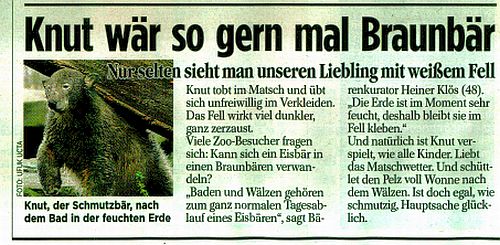 Doch eins lass mich anmerken: TD sah sehr traurig und angefressen aus. Armer Knut, armer TD- schade, dass sie ncht mehr zusammen kuscheln dürfen. Ich würde ohne Angst zu Knut gehen. Knut beisst nur Menschen, die er nicht mag, weil sie ihm nicht wohlgesonnen sind. Menschen wie wir, denen würde er nichts tun. Und seinem Lebensretter erst recht nicht. Er kennt niemanden ausser ihm. Ausserdem wird Knut niemals einem Menschen, es sei denn er ist nicht gut auf Knut zu sprechen, etwas tun. Das ist meine Meinung zu diesem Thema.