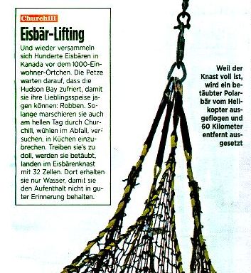 tja, die Eisbären von Churchill. Damals wurden sie einfach abgeknallt. Dann kam man auf die Idee Fallen um Churchill herum aufzustellen und das Gefängnis zu bauen. Tappt ein Eisbär in die Falle, wehrt er sich merkwürdiger Weise nicht, sondern wartet ab was mit ihm passiert. Er wird betäubt, ins Gefängsnis gebracht, nach einigen Tagen wieder betäubt und per Hubschrauber viele Kilometer weggeflogen, wird freigelassen. Da Eisbären ein Langzeitgedächtnis haben, werden sie nie wieder nach Churchill zurückkehren. So hieß es jedenfalls in den Fernseh-und Filmberichten. Das schien sehr überzeugend und jedenfalls eine bessere Lösung als das Töten.