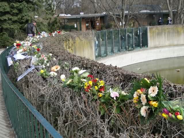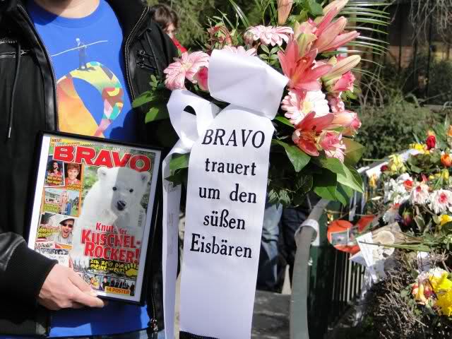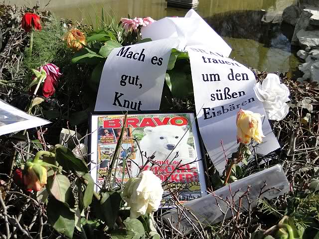 Am späten Nachmittag kamen zwei junge Männer von der Jugendzeitschrift BRAVO um ein Foto und Blumen ans Gehege zu legen. Sie haben sehr viele Zuschriften von Jugendlichen wegen Knut bekommen. Als ich mittags den Zoo verließ, waren die beiden Reporter gerade dabei, sich ins Knut - Gedenkbuch einzutragen.