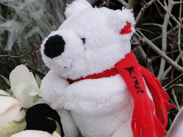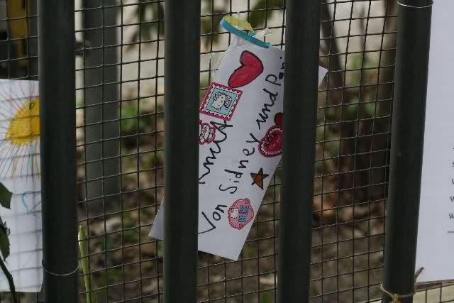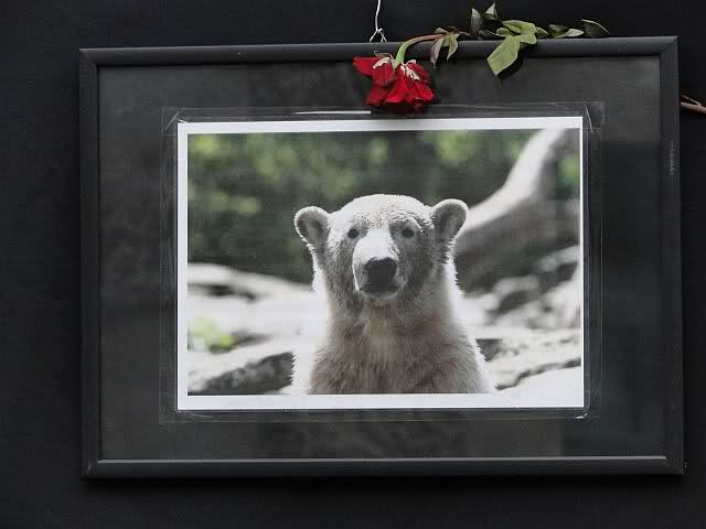 Heute waren sehr viele Schulklassen bei "Knut" und haben Blumen und Zeichnungen am Gehege niedergelegt.