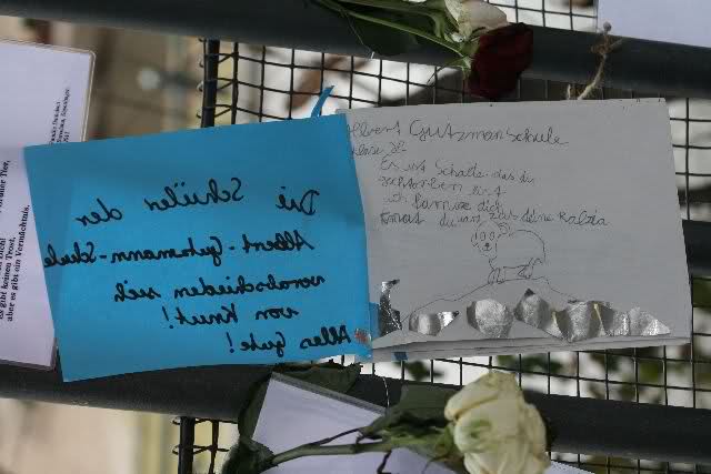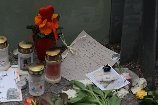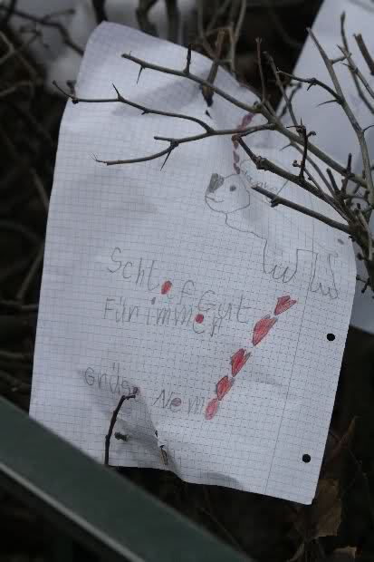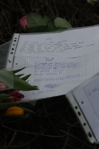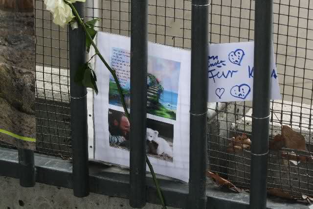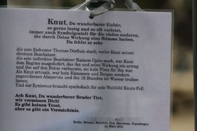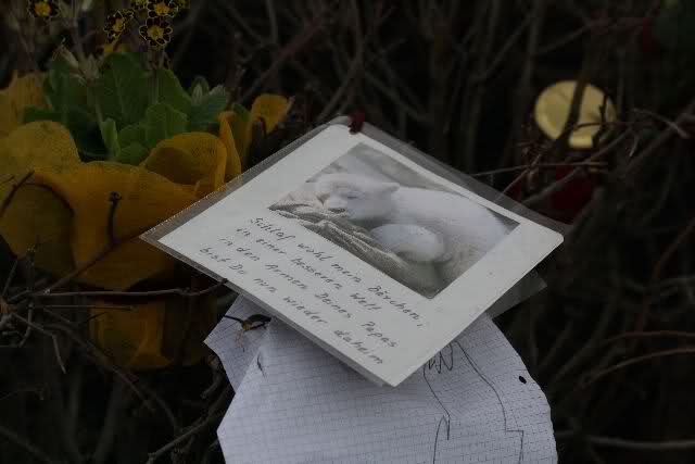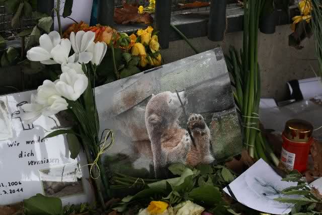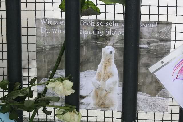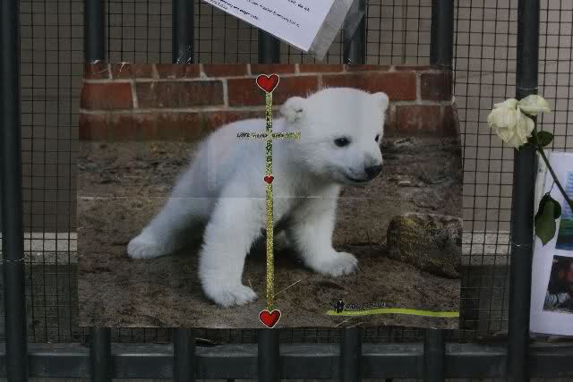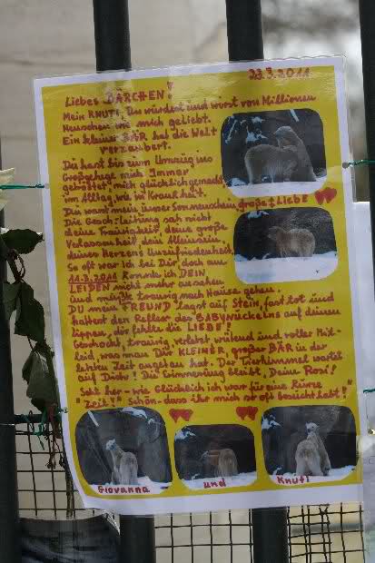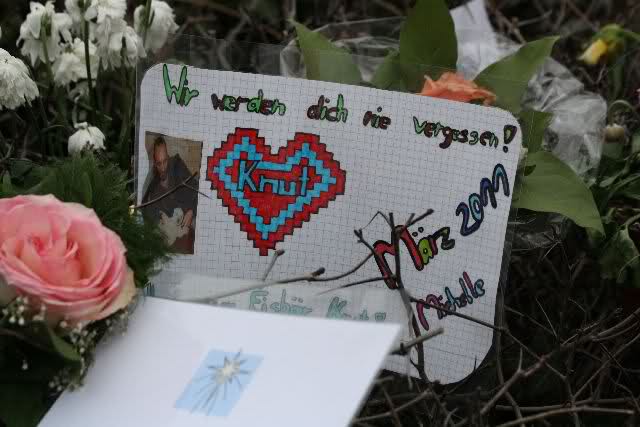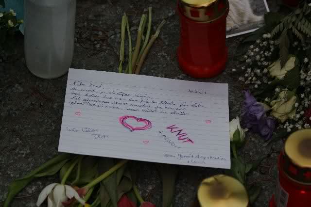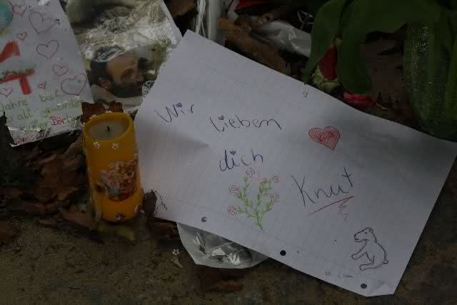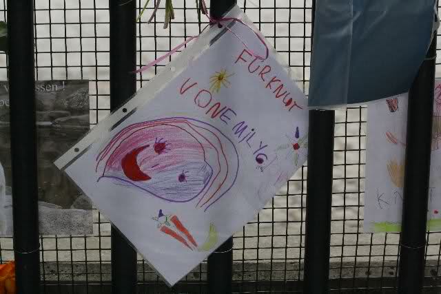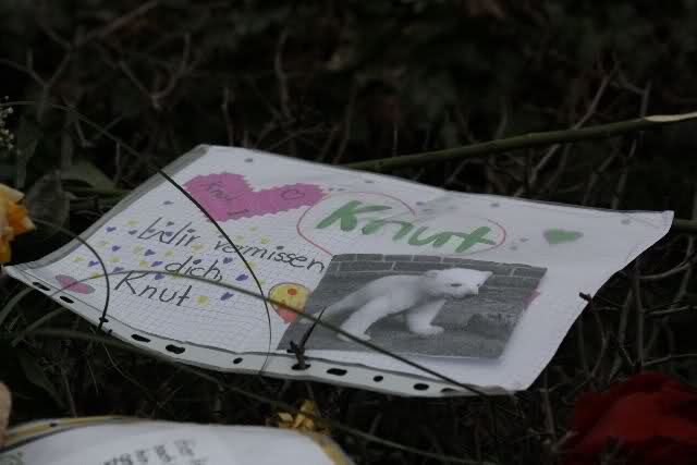 Auch heute waren Schulklassen an der Anlage, um sich von Knut zu verabschieden. Von einer Grundschulklasse sagte der Lehrer zu mir, daß sie mit Knut groß geworden sind. Viele dieser Kinder legten Blumen, selbstgemalte Bilder und Stofftiere an die Anlage. Ein Mädchen weinte bitterlich und wurde von den Mitschülerinnen getröstet.