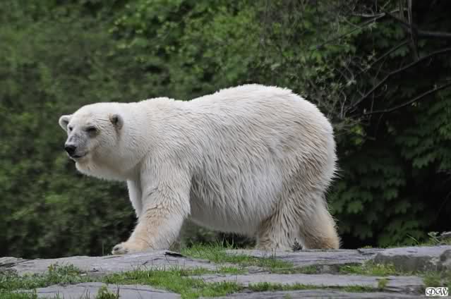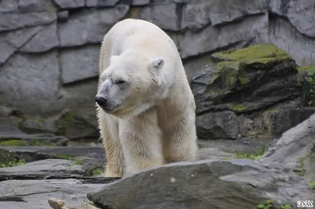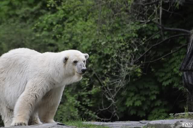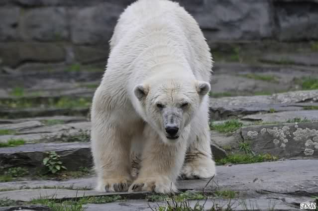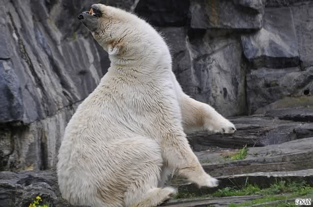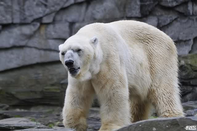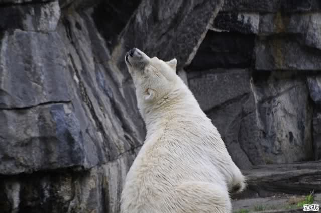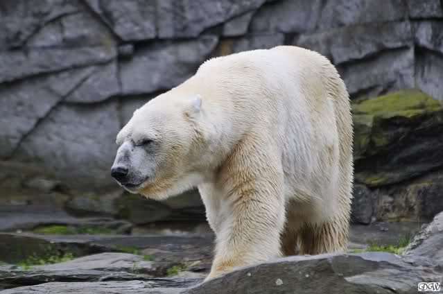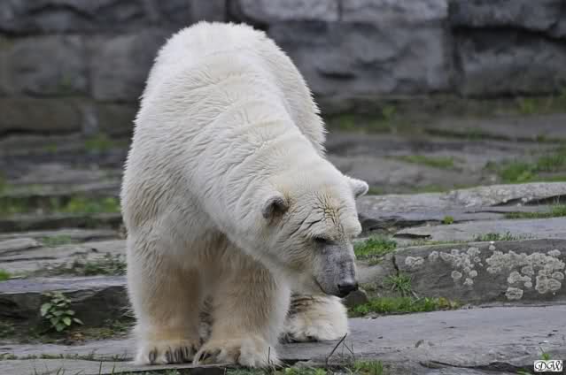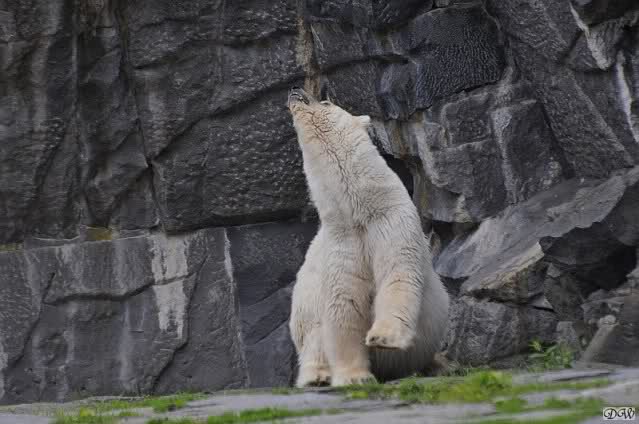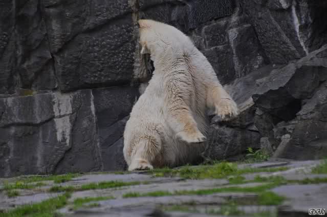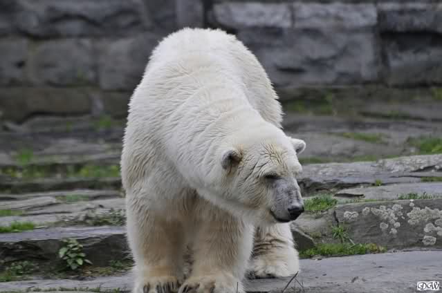 Dann waren die Eisbären dran, die gleich gegenüber wohnen. Eigentlich hatte ich gehofft, Yoghi kennenzulernen. Aber heute war Troll draußen, gut zu erkennen an seinem markanten Gesicht. Troll war heute ausgesprochen aktiv. Er marschierte ständig vor Aika hin und her, als wolle er sich ihr präsentieren. Dann ging Troll ins Wasser, eine Runde schwimmen. Naja, wenn nebenan so ein junger Münchener Kerl zur Untermiete wohnt, muss man zeigen, wer man ist und sich fit halten.