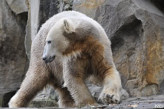 Eine Überraschung hatte er aber doch doch parat heute. Der Schieber ging auf und hinein flitzte - Knut, nicht Gianna. Gianna blieb draußen und war ganz offensichtlich verwirrt. Später ging sie hinein, lief drinnen hin- und her, kam wieder heraus und war unruhig. Als wir den Zoo verließen, lief sie noch immer hin und her. Offensichtlich fand sie diese neue Situation nicht prickelnd.