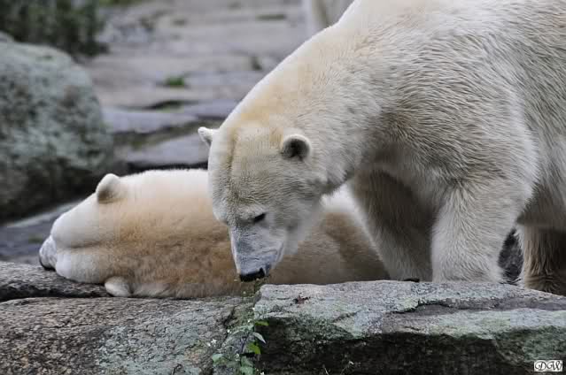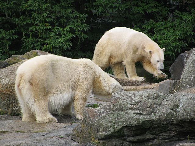 Nach der Fütterung lief Knut über die Anlage und stellte sich vor Katis Höhle. Kati sah dies und kam an. Beide brummten sich an bis Kati sich zurückzog. Als Knut runter zu seinem Felsen wollte, kam Kati angerannt. Ich wußte gar nicht, daß sie so schnell rennen kann. Knut drehte sich dann um und Kati stoppte. Und ging zurück.