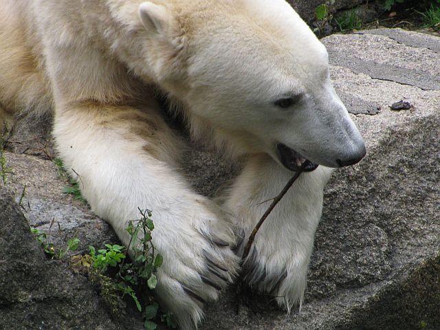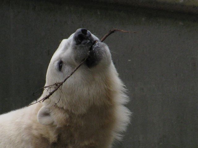 Besuch bei Knut und Co. am späten Nachmittag. Tosca führte heute die große Lippe. Als Knut in der Mitte der Anlage saß, kamen die drei Großen und blafften ihn an. Die Lauteste war Tosca. Nach einer tollen Tapirlippe entschloss sich Knut lieber wieder zu seinem Plateau zu gehen. Dort friemelte er so lange in einer kleinen Spalte umher, bis er kleine Grashalme herausgeholt hatte und spielte mit den kleinen Gräsern.
