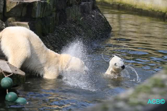 Beide Bären toben schon seit Vormittag im frischen Wasser. Offensichtlich hat die Reinigung der Anlage, wider Erwarten des Zoopersonals, nicht so viel Zeit beansprucht wie anfangs angenommen.
