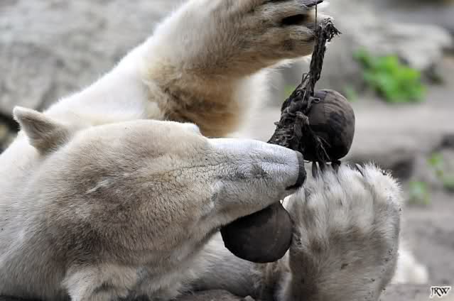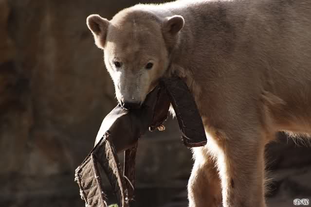 Als ich heute Nachmittag in den Zoo ging spielte Knut mit seinem Nackthuhn. Zum Schluß schnappte er sich sein Huhn und verschwand in der Höhle.