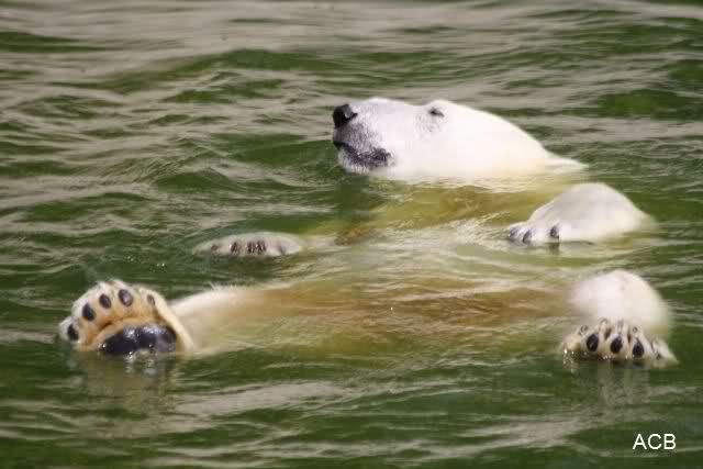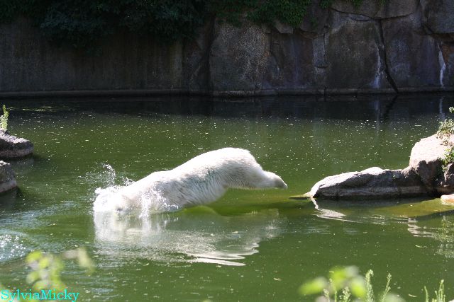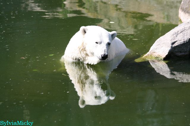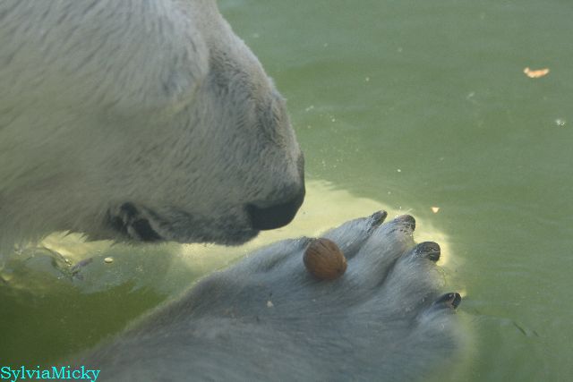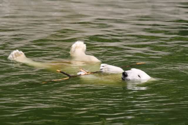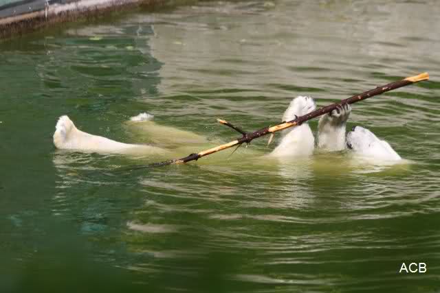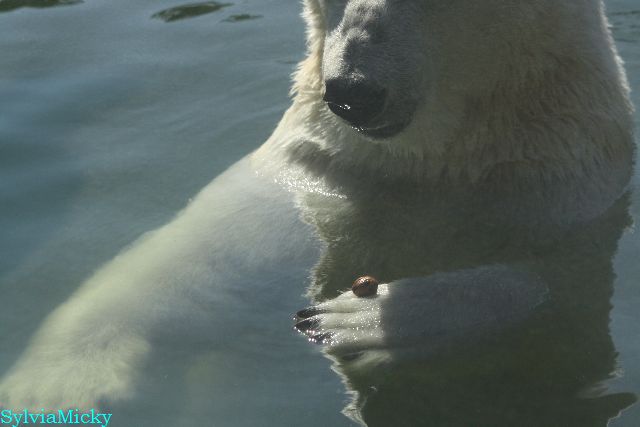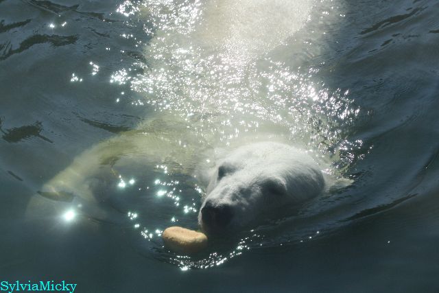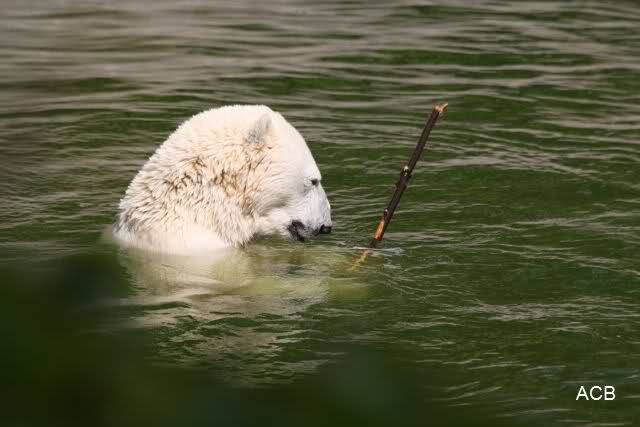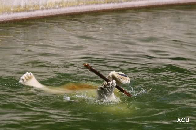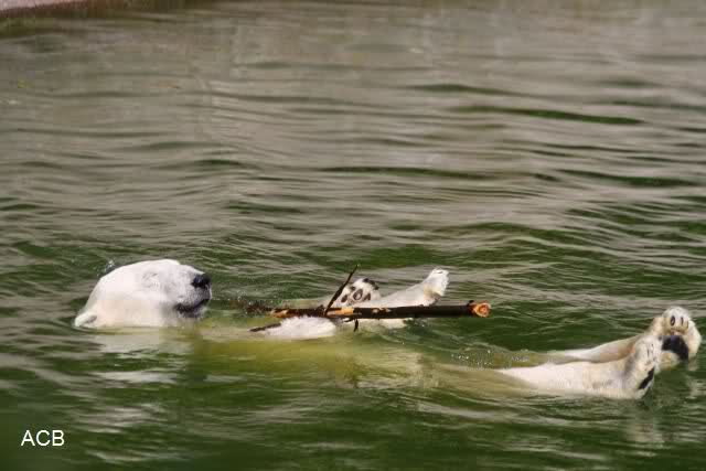 Im großen Eisbären-Becken hatte Nancy viel Vergnügen mit einem Zweig. Es hat sehr viel Spaß gemacht ihr zuzusehen. Viele der Zuschauer hätten bei der Hitze sicher gern mit ihr getauscht