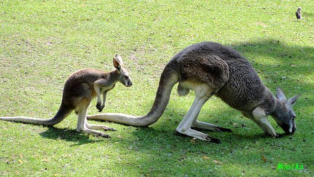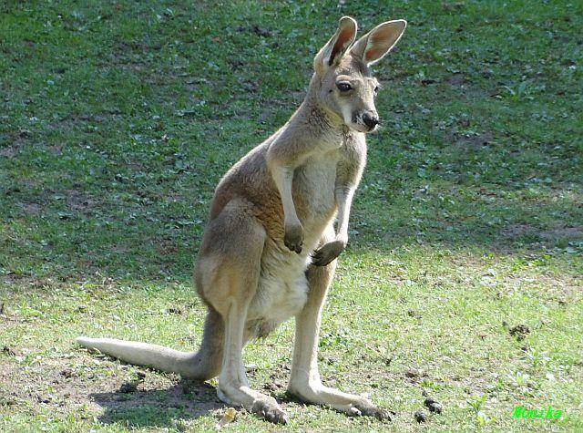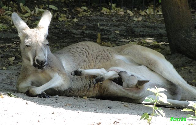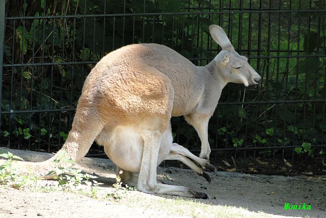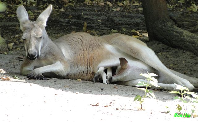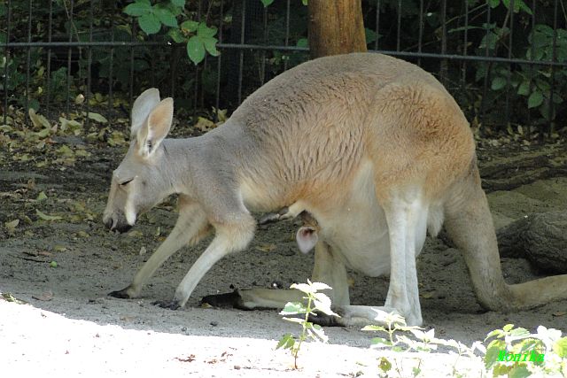 Bei den Riesenkänguruhs gibt es Nachwuchs. Das eine Kleine ist noch im Beutel.