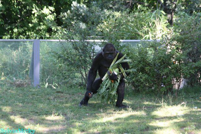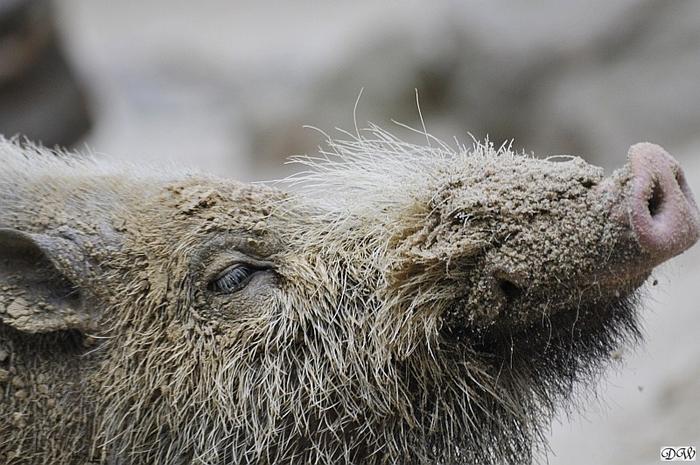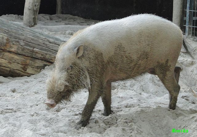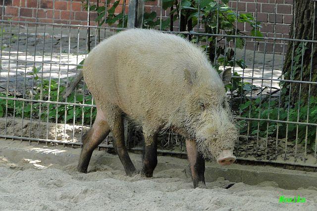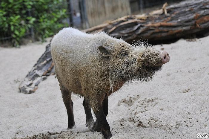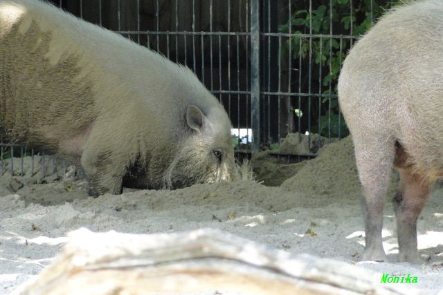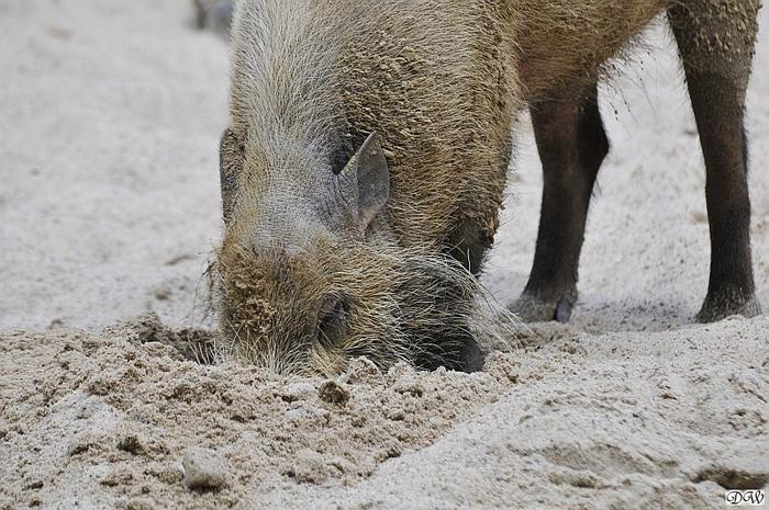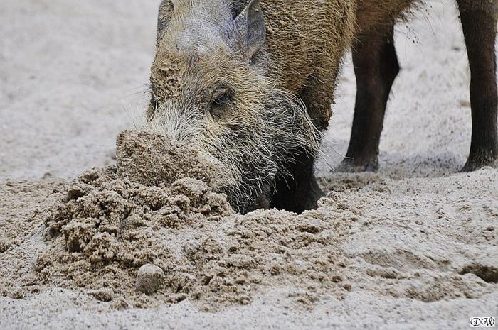 Neo pflügt und gräbt seit fast einer Woche die neugestaltete Anlage um. Der Sand wurde vollkommen ausgetauscht und eine Drainage eingebaut. Somit müssen die Bartschweine wenigstens nach viel Regen nicht wochenlang im Schlamm stehen. Neo scheint es außerordentlich zu genießen soviel Platz und losen Sand zu haben. Wenn man ihn ruft, kommt er noch immer und antwortet mit einem Grunzen.