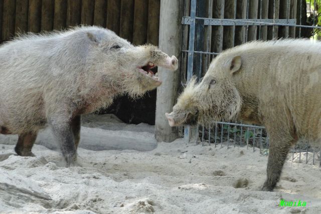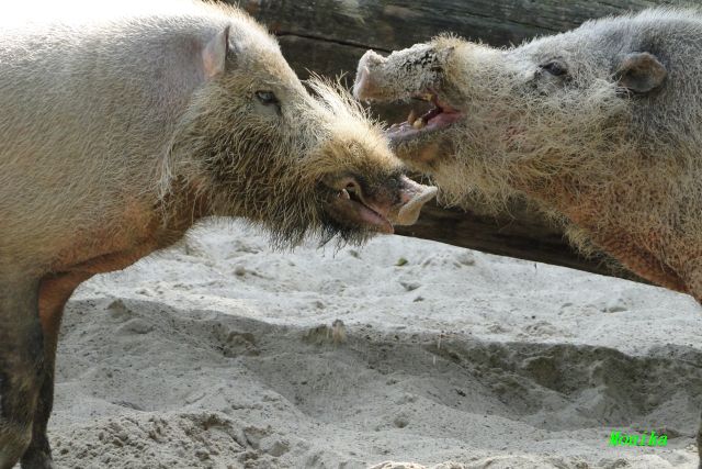 Vor kurzer Zeit ist die Sanfteste unter den Bartschweinsäuen gestorben. Sie war Neo's Mutter. Wir sind gespannt, wie es mit Neo und den Weibchen gehen wird. Noch ist er kleiner als sie. Man wird mit einem Weibchen anfangen und wenn es gut geht, in kleinen Intervallen die anderen zufügen.