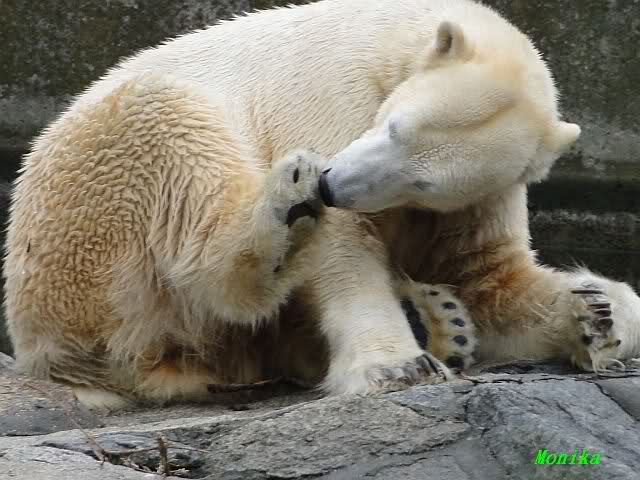 Das ging auch nach der Fütterung so weiter. Knut blieb auf der Insel. Er beschäftigte sich, wie bereits vor der Fütterung, mit Zweiglein und machte oft "Sitzmännchen".