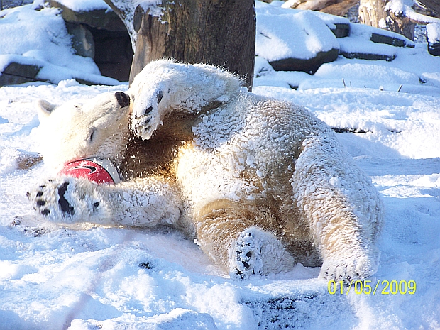 Als mir Monika heute im Zoo einige dieser Fotos zeigte, strahlte sie über das ganze Gesicht und zwar deshalb, weil wir auf der Arbeit waren und sie die tollen Bilder machen konnte. An diesem Tag passte auch alles zusammen: Schnee, strahlender Sonnenschein und ein glücklicher Knut. Herzlichen Dank für's Zeigen.
