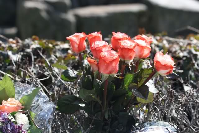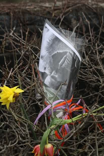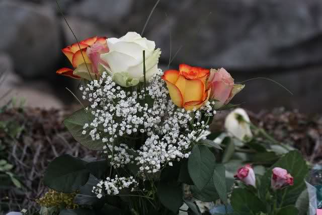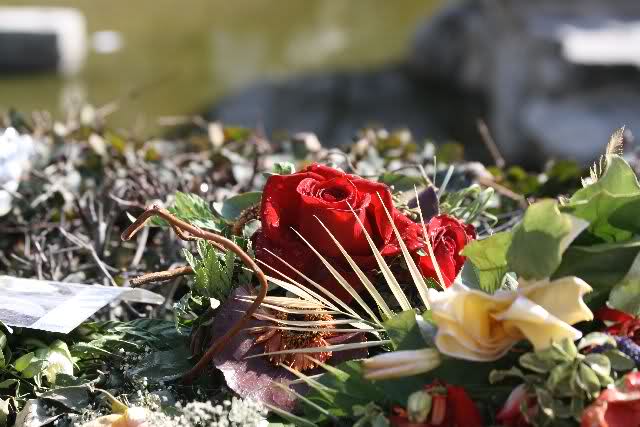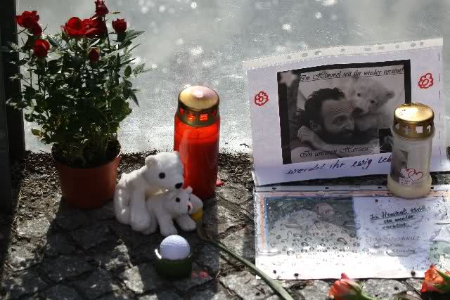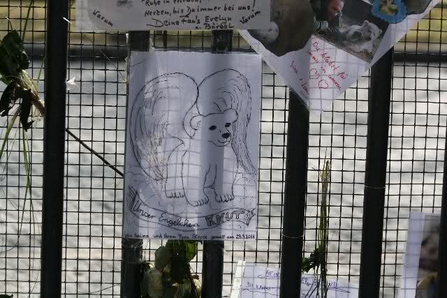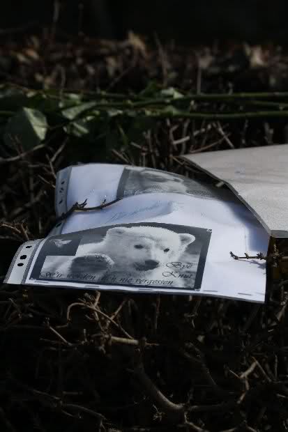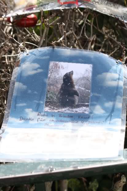 Je näher ich zum Eisbär Felsen kam, um so langsamer wurden meine Schritte. Seit gestern Abend sind wieder viele, viele Blumen dazu gekommen, und auch weinende Männer legen, ganz ehrfürchtig, Blumen für unseren "Knut" ab. Viele Menschen, sämtlicher Nationen, standen dort, wo unser "Knut" einst "wohnte" und schämten sich ihrer Tränen nicht. Es überkam mich (Anne) eine innere Verbundenheit, und etwas wie Ruhe überzog mein wundes Herz.