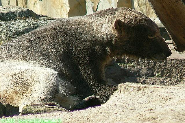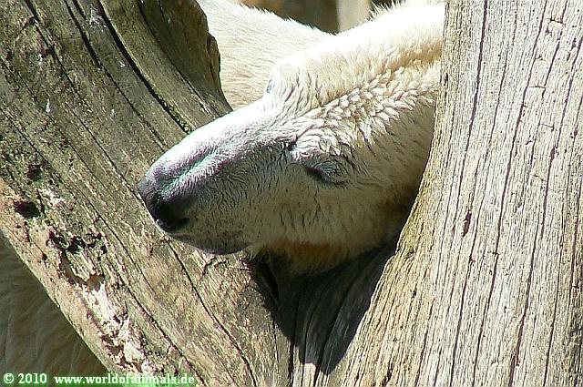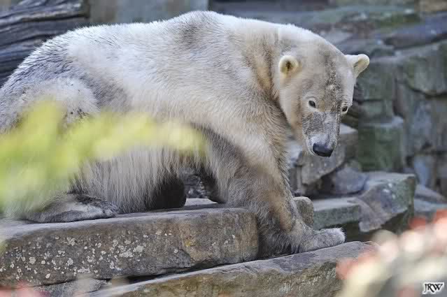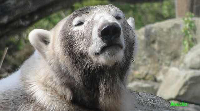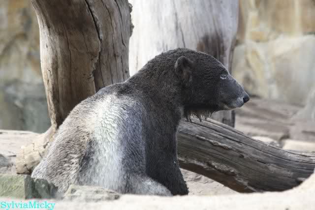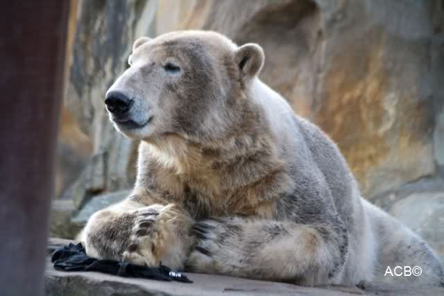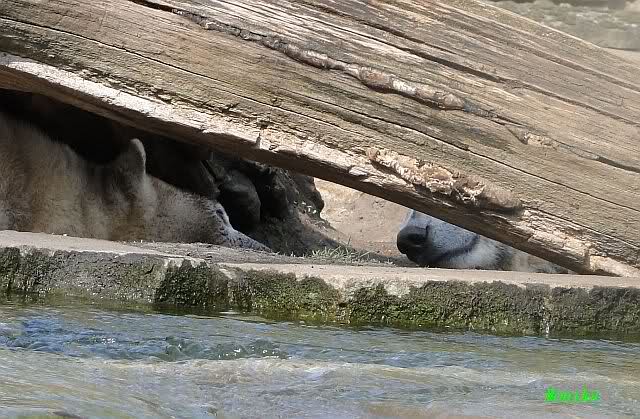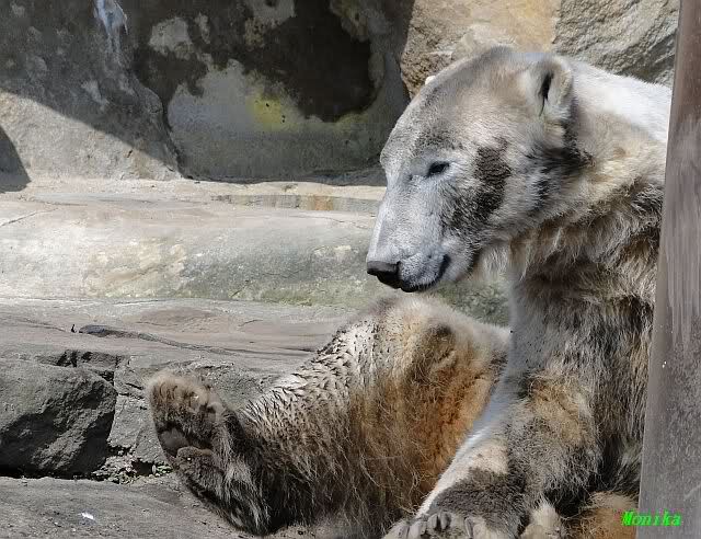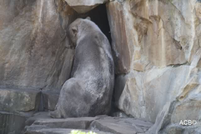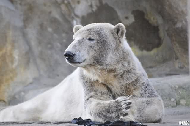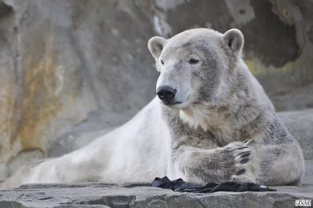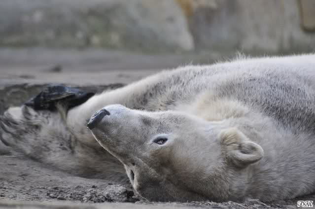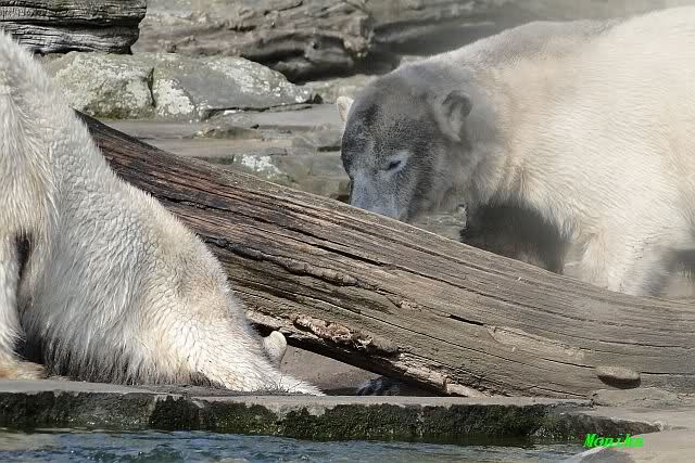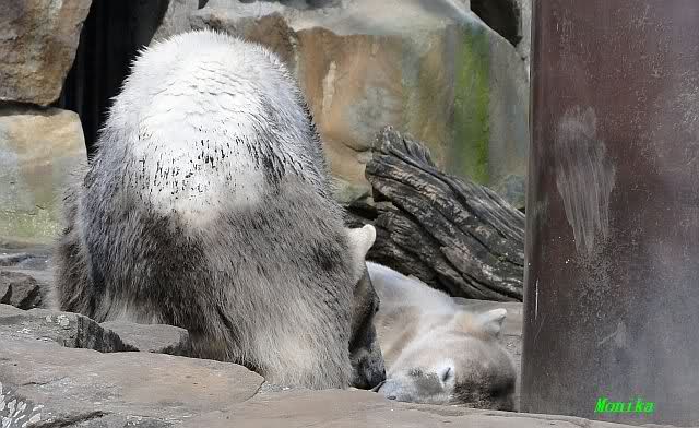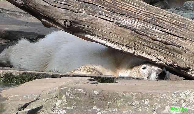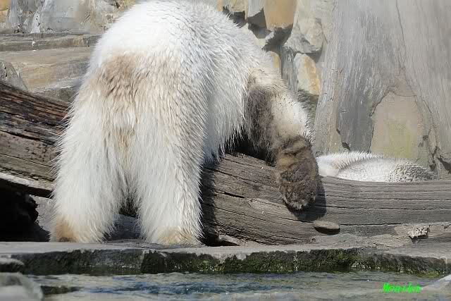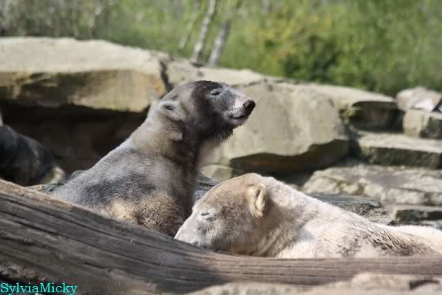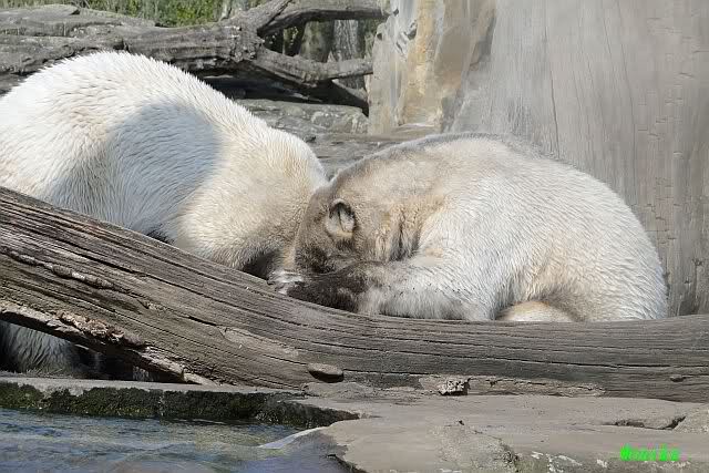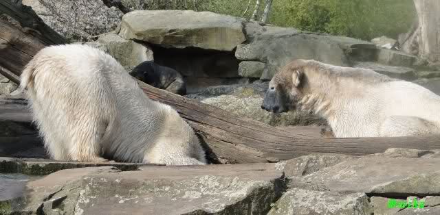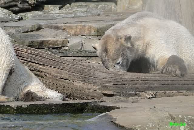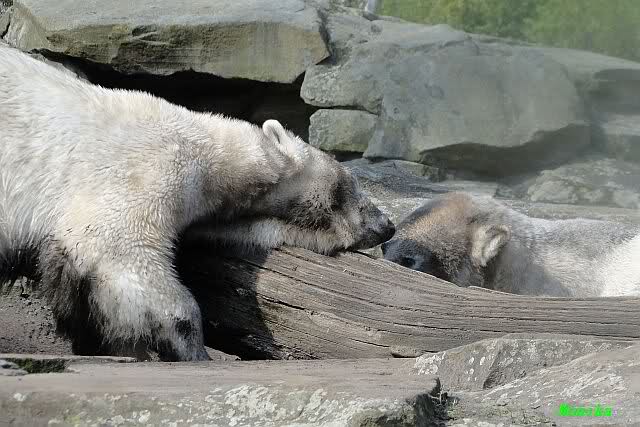 Heute morgen sollen die Beiden schon im Wasser gespielt haben. Als ich etwas später kam, war Knut gerade dabei, sich einzufärben. Immer wenn er sich hinlegte, kam Gianna ganz langsam auf ihn zu, dass er es kaum bemerkte. Wechselte er seinen Platz und schlief wieder ein, kam sie schon wieder auf ihn zu. Entweder war sie heute sehr liebebedürftig oder sie konnte Knut einfach nicht liegen sehen. Als Gianna sich gegen Mittag endlich hinlegte, schwamm Knut eine Runde und legte sich dann auch zur Ruhe.