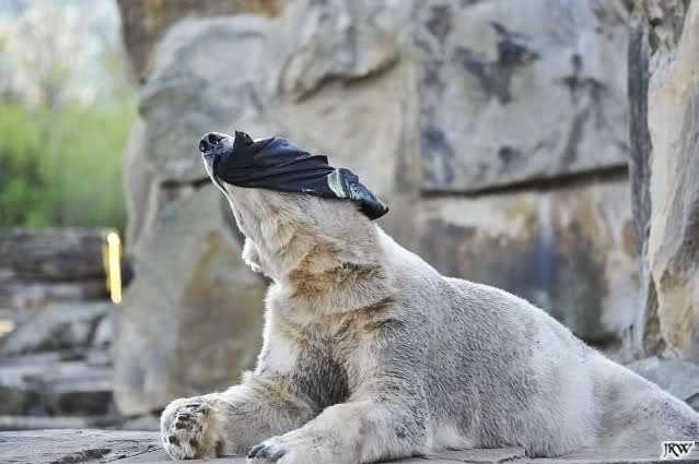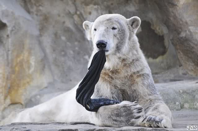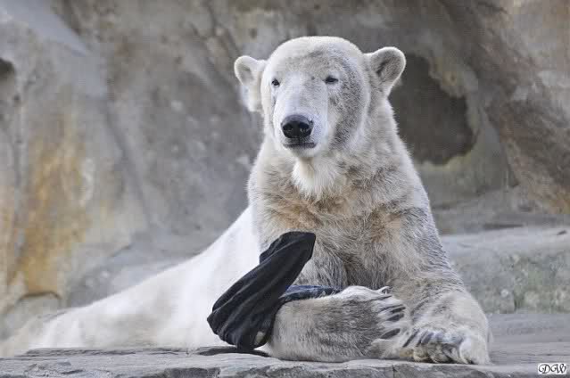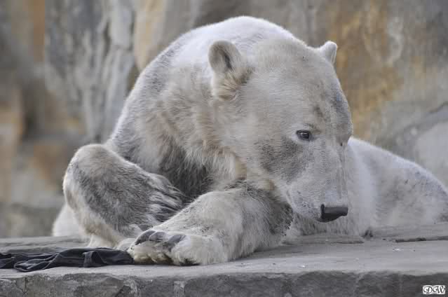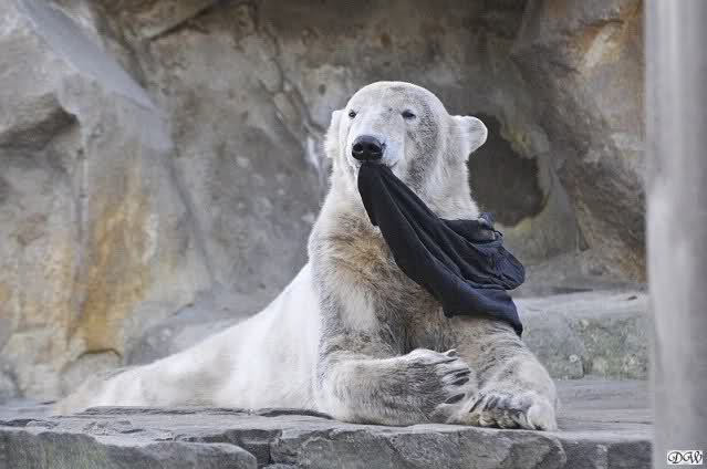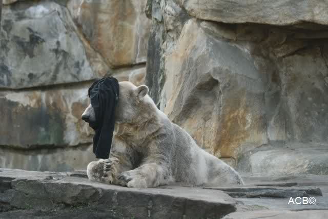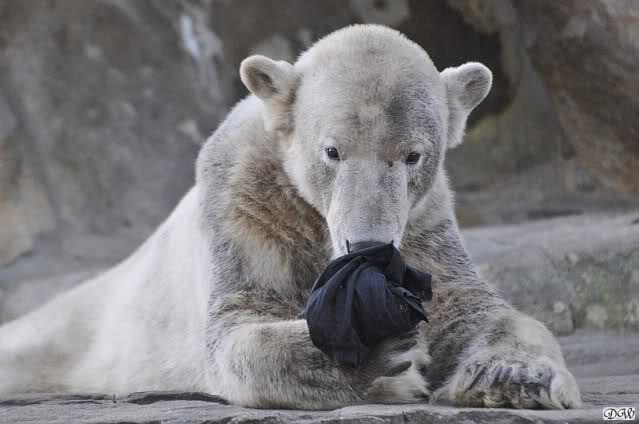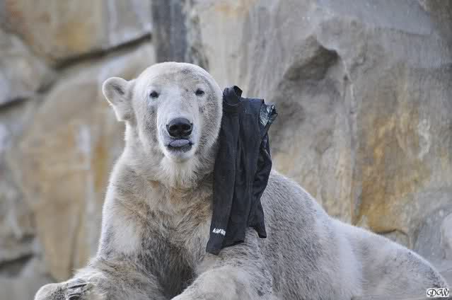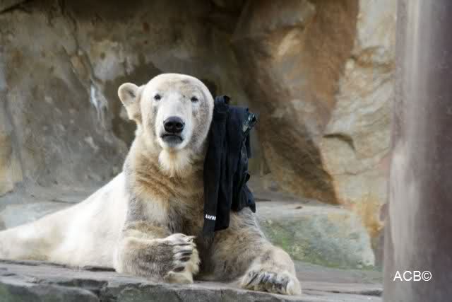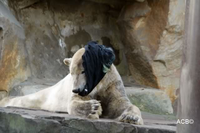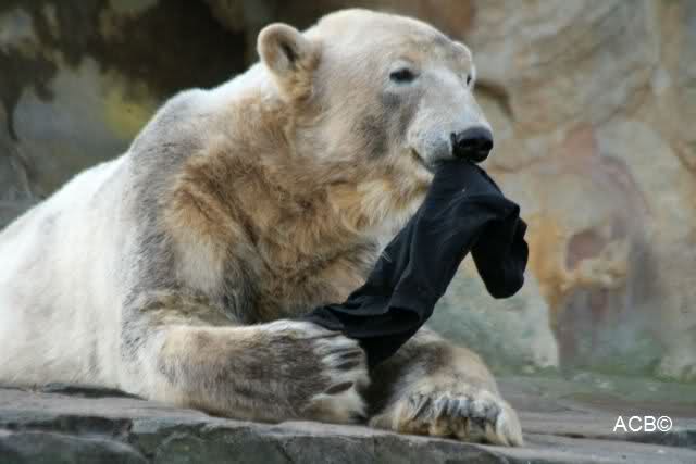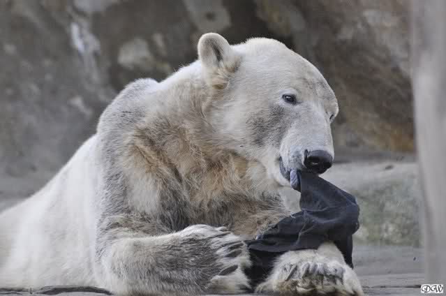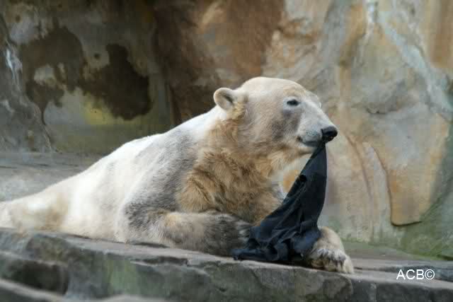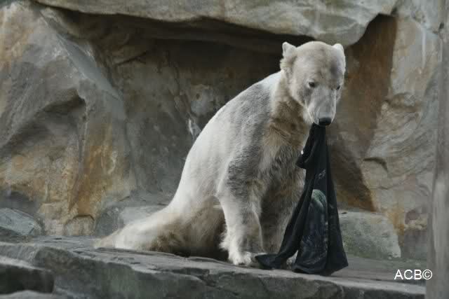 Knut scheint sein T-Shirt immer wieder in seiner Höhle zu verstecken, denn er lässt es nie auf der Anlage liegen. Sicherlich ist das der Grund dafür, dass es noch immer existiert. Turbo-Gianna macht mit solchen Dingen immer ganz schnell Fransen aus den Stoffdingen. Er ist halt nicht nur ein schöner, sondern auch ein kluger Bär! Besonders schön ist es zu sehen, dass er seine alte Gelassenheit wiedergefunden hat und so wundervoll ruhig und gelassen vor sich hin spielt. Immer wieder ist es eine Augenweide ihm zuzusehen.