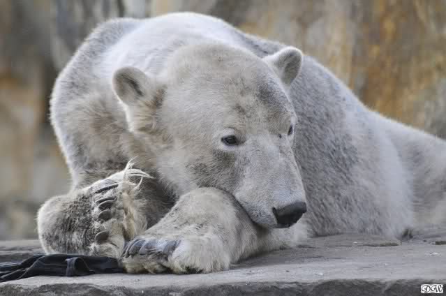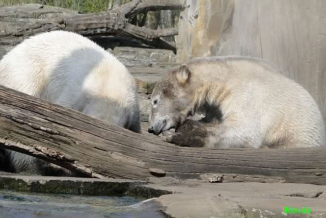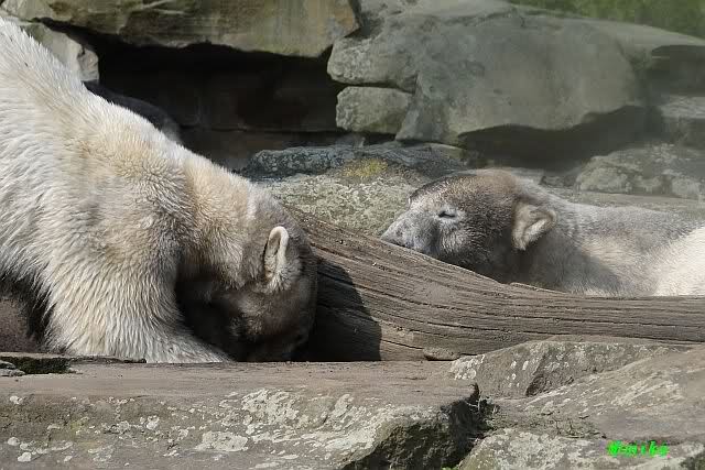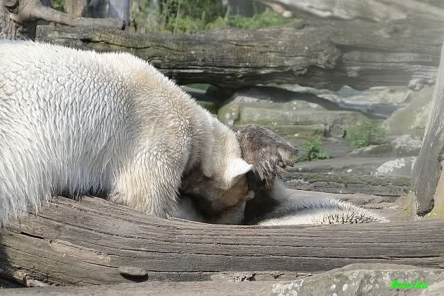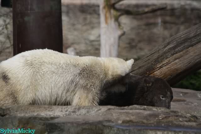 Auch ich war heute Nachmittag bei dem wunderschönen Frühlingswetter kurz im ziemlich vollen Zoo und habe einige Bilder mitgebracht. Nach dem Spielen begaben sich die beiden Bären Youngster zur Sonntagsruhe. Vorher schwärzte sich Knut allerdings wieder ein.
