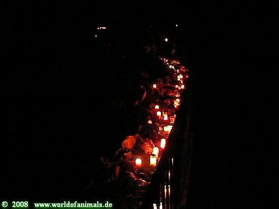 Wenn man den Zoo verlässt, kommen einem viele Menschen mit Blumen in den Händen entgegen. Sie alle haben Thomas Dörflein geschätzt und geliebt und wollen ihm noch eine Ehre erweisen. Und das Blumen- und Lichtermeer vor dem Löwentor wächst und wächst…