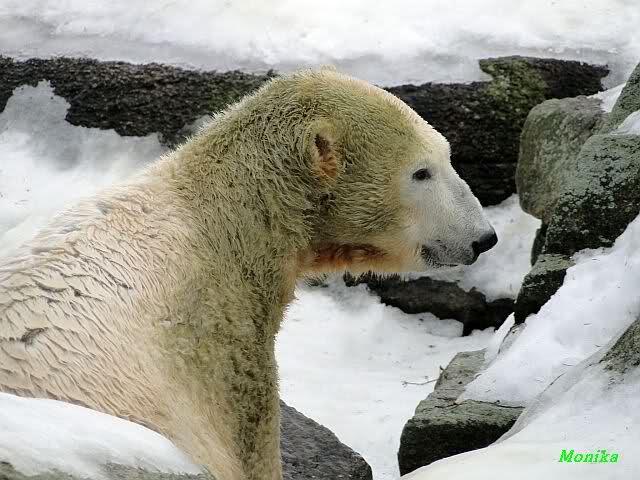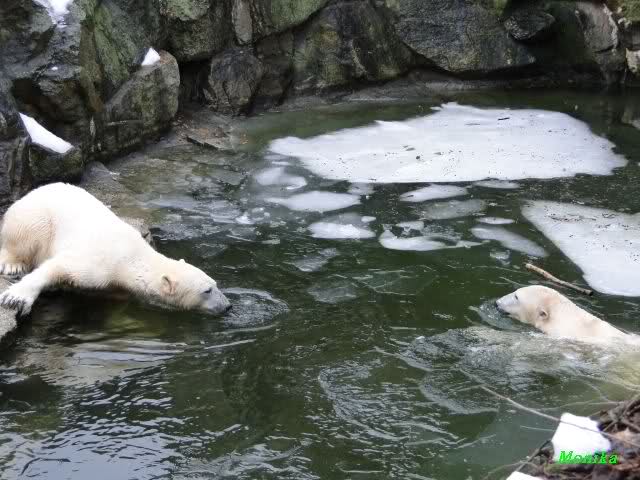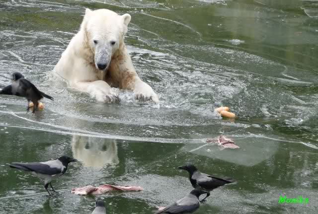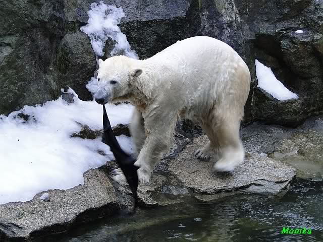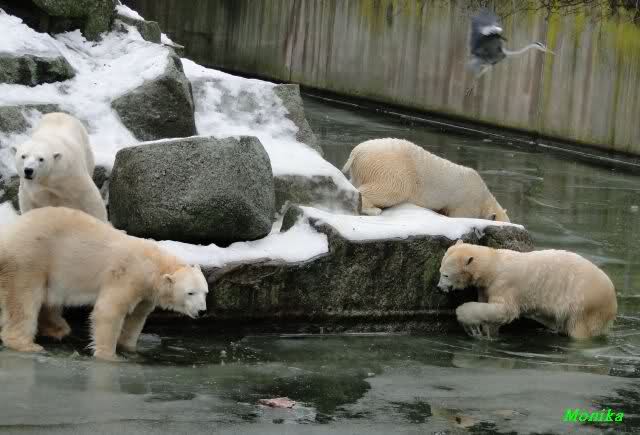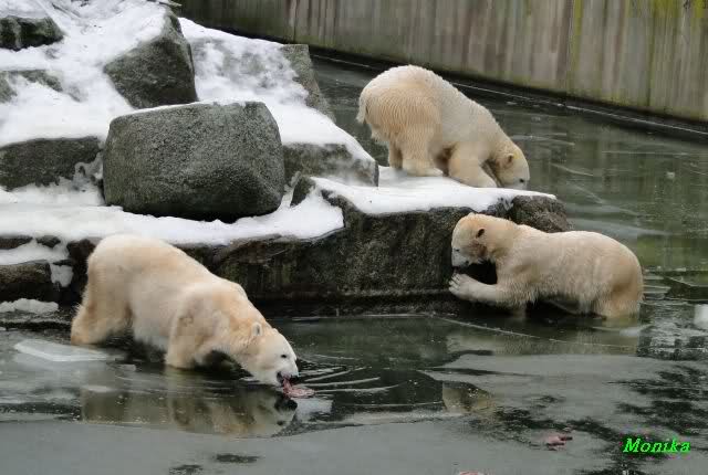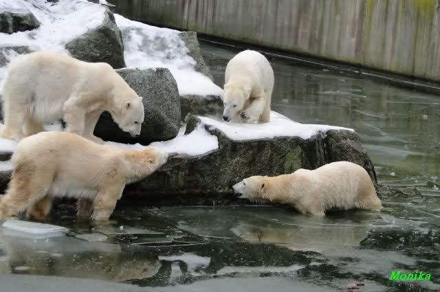 Die Fütterung verlief heute auch mal wieder anders als gewohnt. Sie warteten alle Vier ziemlich dicht beisammen. Das Futter landete aber auf dem Eis. Sie schauten alle ein bißchen dumm aus der Wäsche. Knut winkte, aber es half nichts. Er mußte ins Wasser, was er dann auch als erster tat. Natürlich wurde auch wieder dabei gebrummt. Nancy und Kati gingen leer aus, da sie nicht ins Wasser wollten. Tosca holte sich später noch alles, was sie im Wasser fand.