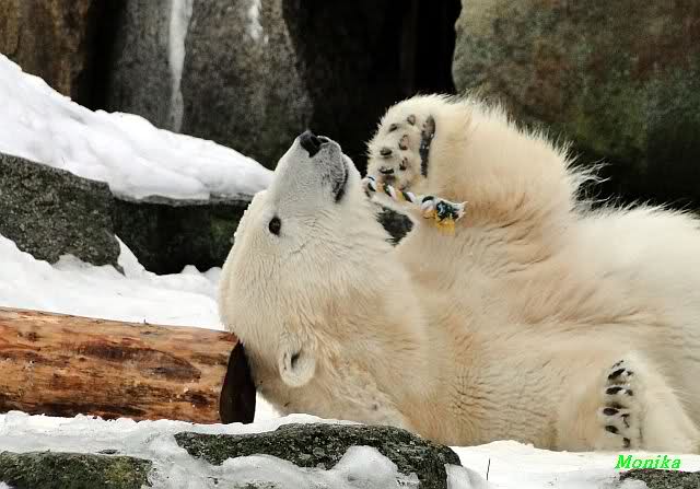 Als Fr. Weckert mit dem Futtereimer kam, suchte sie erstmal die Bären. Knut war noch hinten im Wasser, und Tosca spielte mit einem Tau mit Tennisball, das wohl wieder jemand verbotener Weise reingeworfen hat. Obwohl Fr. Weckert ein paar Mal gerufen hatte, spielte Tosca lieber mit dem Tau und Knut ließ sich auch erst nicht blicken.