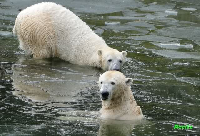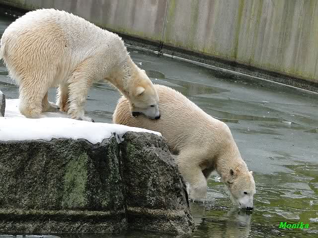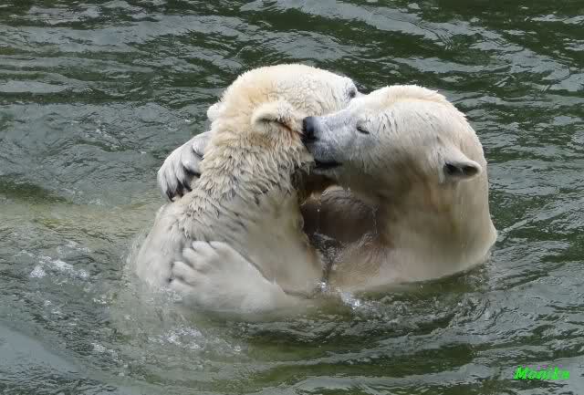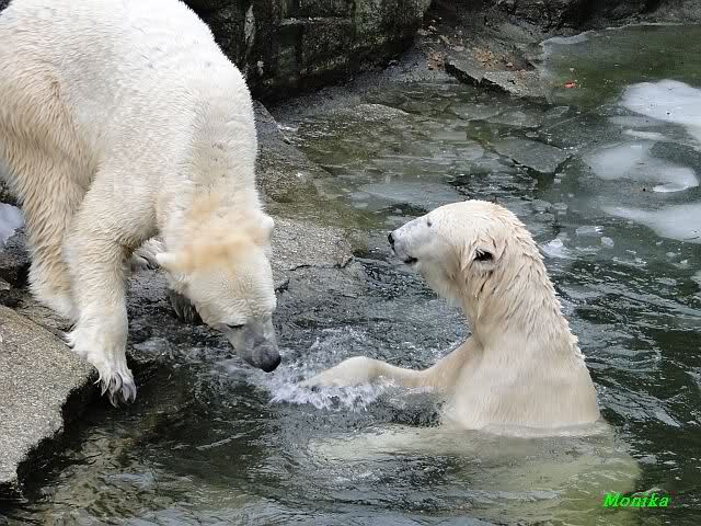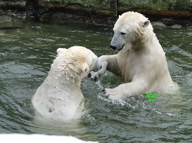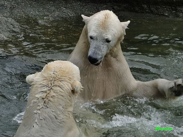 Ha,ha! Solche Missverständnisse passieren mir mit meinem Mann sehr oft. Für uns ist das nicht wichtig, ob Knut und Tosca im Wasser oder am Land gespielt haben. Hauptsache, sie haben gespielt. Es ist immer wieder interessant, wie Knut und Tosca die Nasen in die offenen Schnauzen gegenseitig reinstecken.