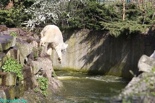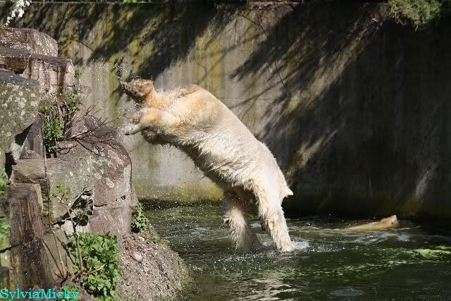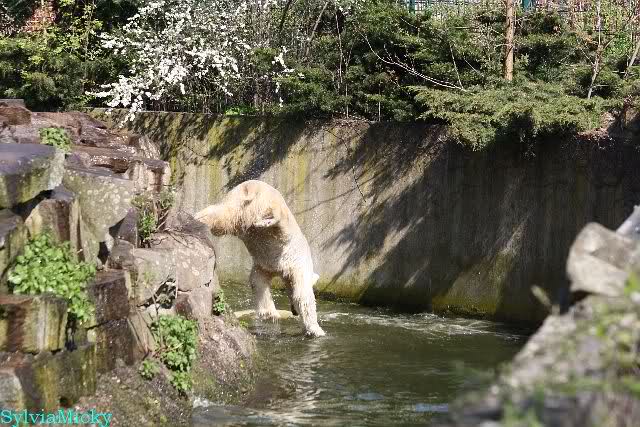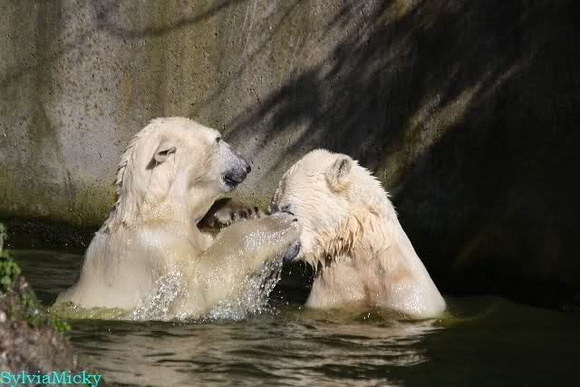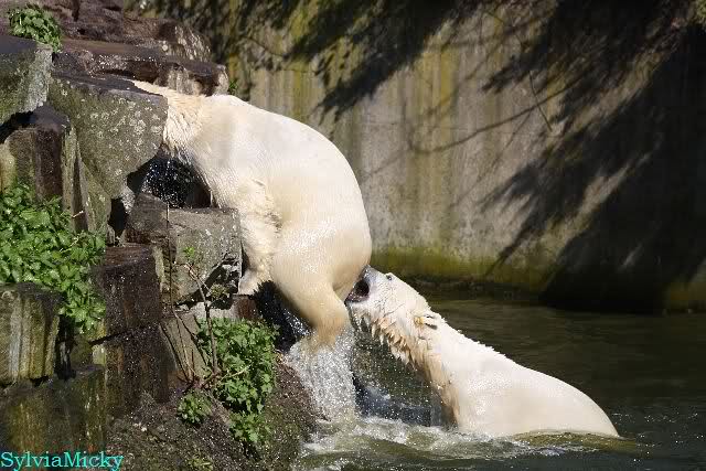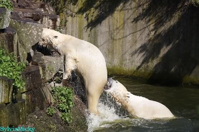 Bei strahlend blauem Himmel, Sonne satt und warmen 20 Grad waren Knut und Gianna heute in bester Spiellaune. Sie tobten bereits um 9.00 Uhr im Wasser. Zwischendurch wurde mal ein wenig geruht und gelaufen, um dann wieder erholt über die Anlage zu rennen, immer wieder ins Wasser zu springen um dort zu spielen. Als ich eine halbe Stunde nach der Fütterung ging, spielten sie immer noch im Wasser.