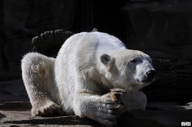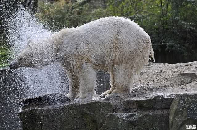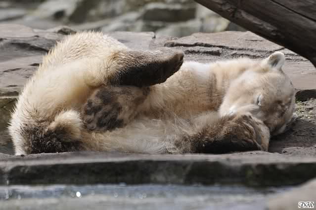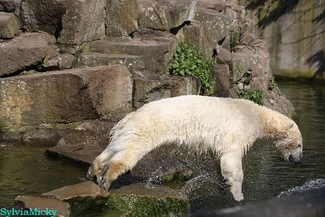 Gianna und Knut hatten am Vormittag gespielt, erst mit dem Nackthuhn und dann zusammen im Wasser. Nachmittags ging es eher ruhig zu, aber schön sind die Beiden trotzdem zu jeder Zeit. Knut färbte sich wieder einmal in Blitzesschnelle ein und viele der Besucher können es immer gar nicht glauben, dass sie Eisbären anschauen. Wenn man ihnen erklärt, wie viel Freude die Tiere daran haben sich im Sand zu wälzen und dass alle neuen Gehege Naturboden haben, sind sie meistens einsichtig und genießen den Anblick.