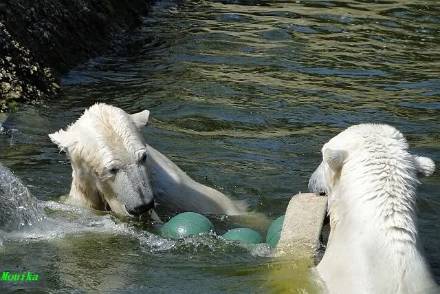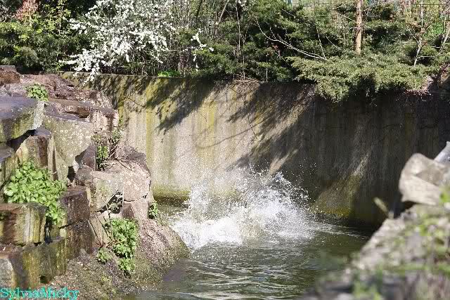 Zur Fütterung bekam Knut u.a. einen schönen großen Lachs. Gespielt haben die beiden nicht viel am Nachmittag. Aber Knut färbte sich wieder rabenschwarz ein. Am Spätnachmittag strömten noch viele Besucher in den Zoo.