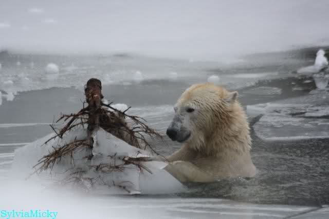 Nach der Fütterung suchte Tosca im Wasser noch Reste und versuchte danach den eingefrorenen Baum ohne Nadeln vom Eis zu bekommen. Sie versuchte sich wieder als Eisbrecher. Schließlich gelang es ihr an den Baum zu gelangen. Sie hatte dann den Baum mit Eisschollen am Wickel.