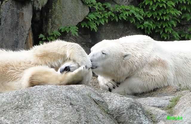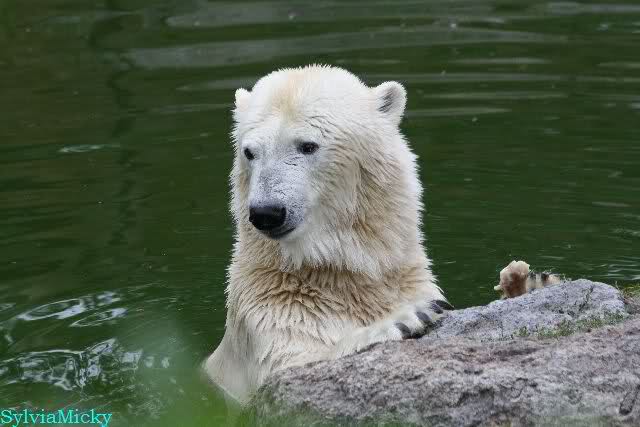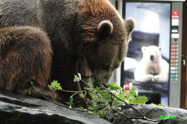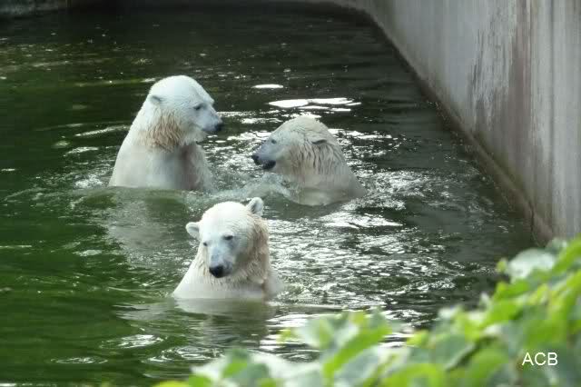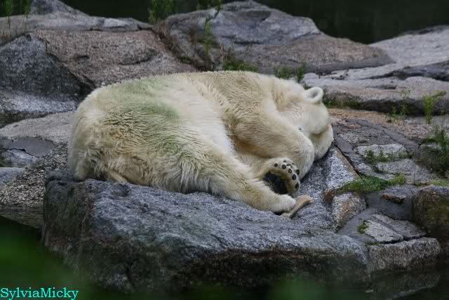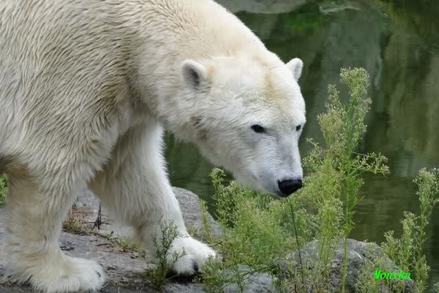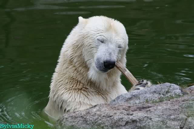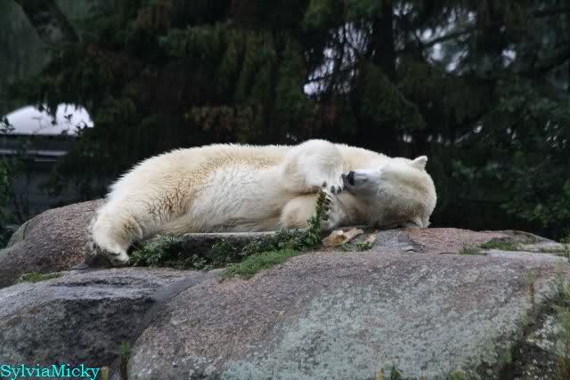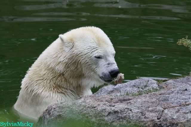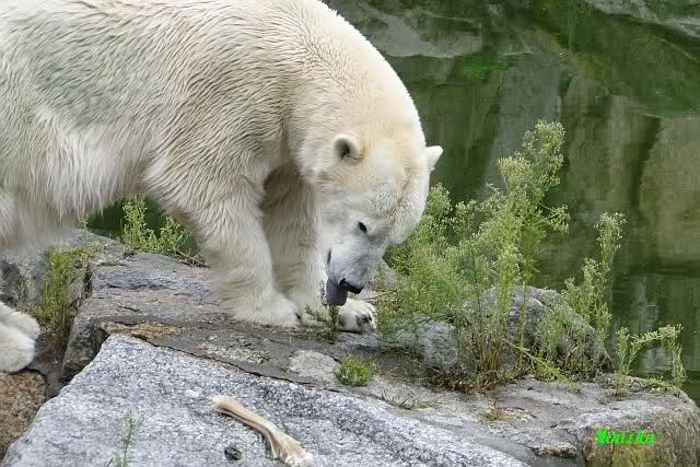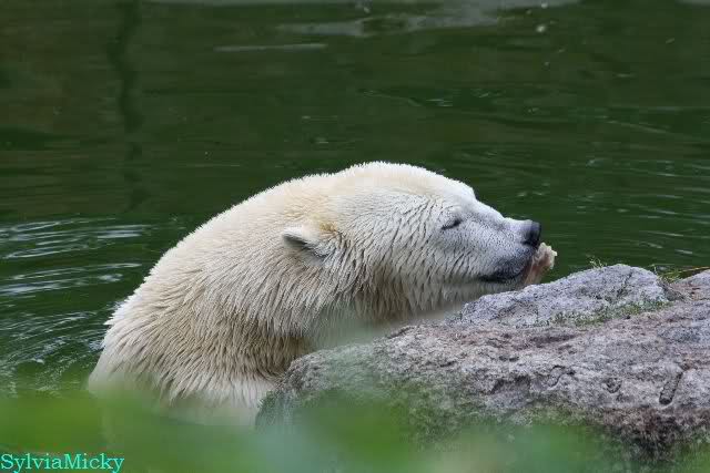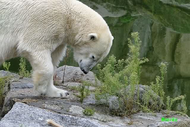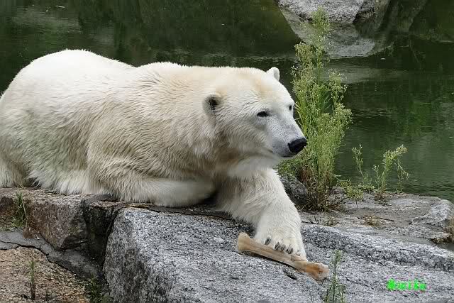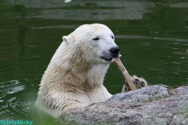 Die drei Eisbärenmädels haben heute wieder Kauknochen bekommen. Am Spätnachmittag saß Tosca vor ihrem Knochen. Auf folgenden Fotos sieht man wieder die unverkennbare Ähnlichkeit mit Knut. Auch Tosca gärtnerte heute.