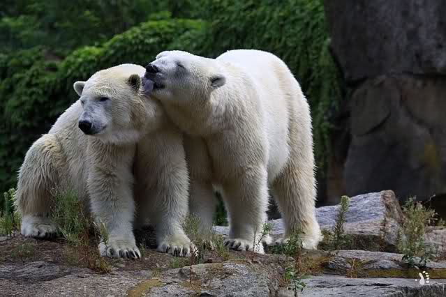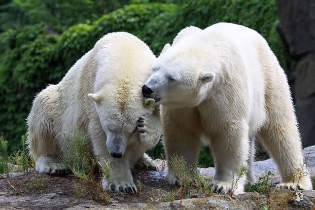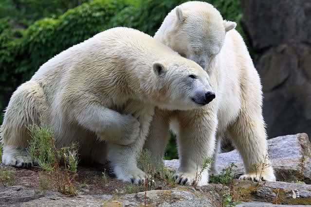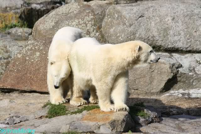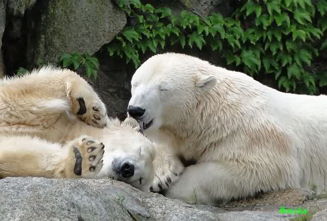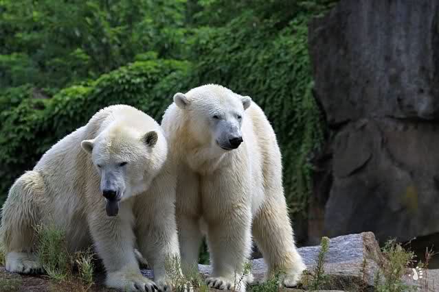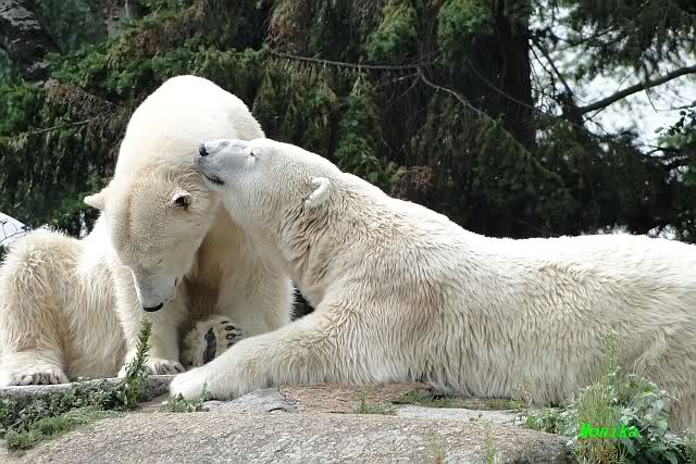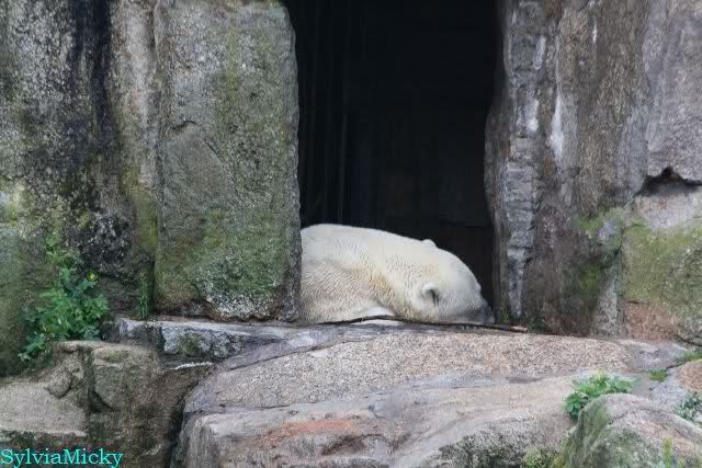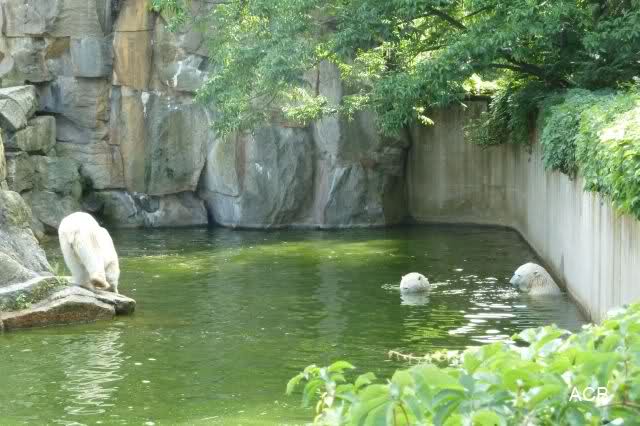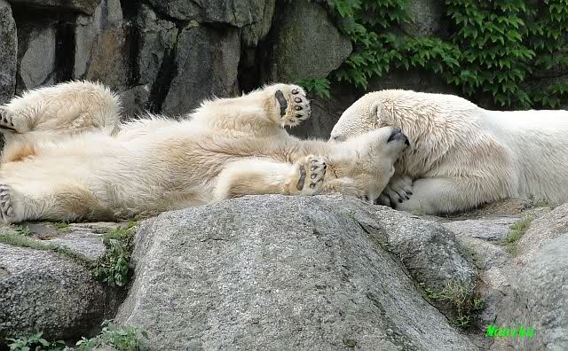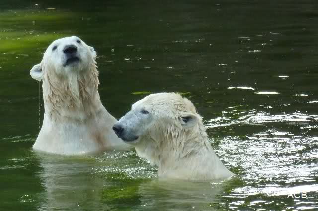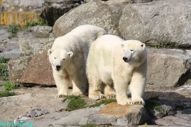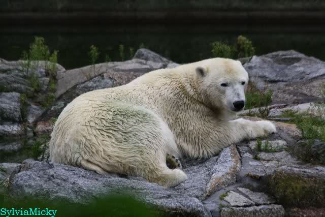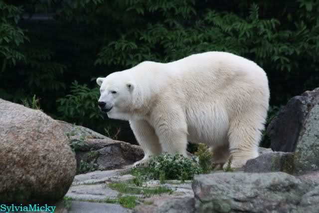 Die drei Eisbärenmädels haben heute wieder Kauknochen bekommen. Am Spätnachmittag saß Tosca vor ihrem Knochen. Auf folgenden Fotos sieht man wieder die unverkennbare Ähnlichkeit mit Knut. Auch Tosca gärtnerte heute.