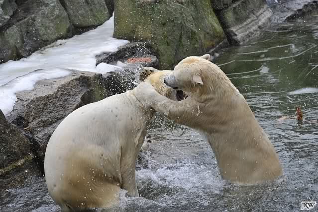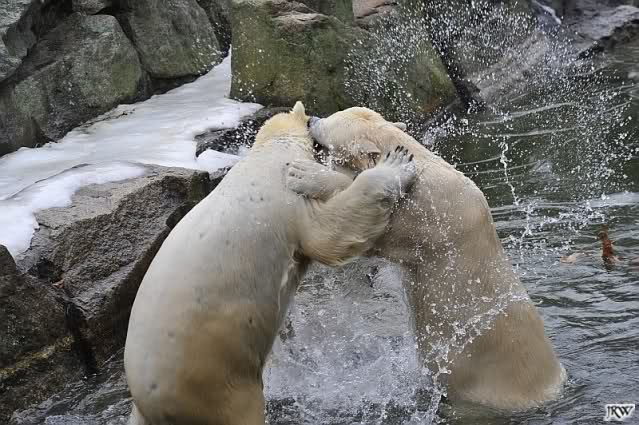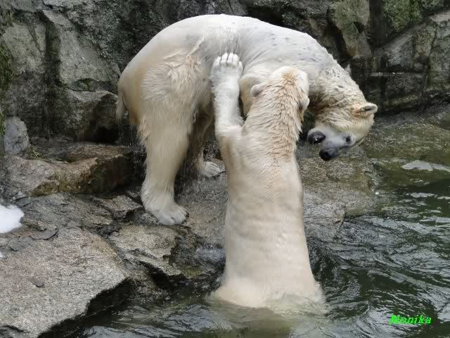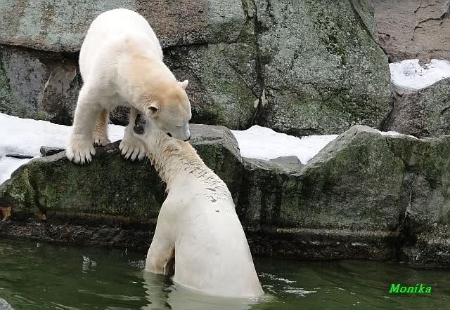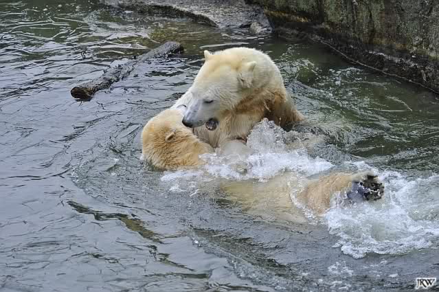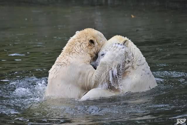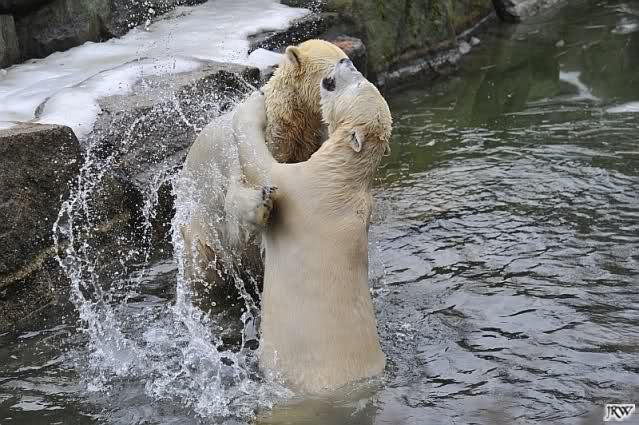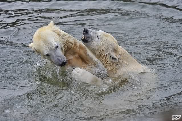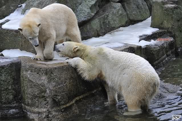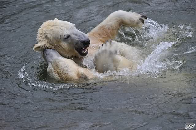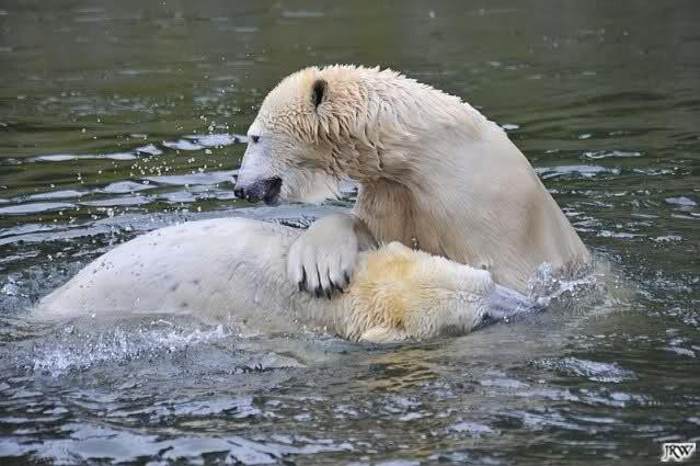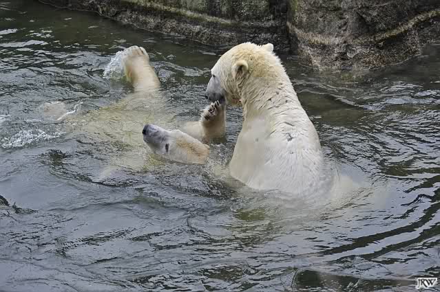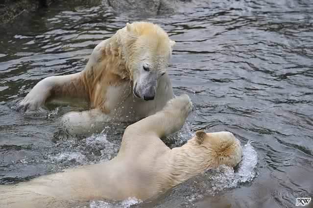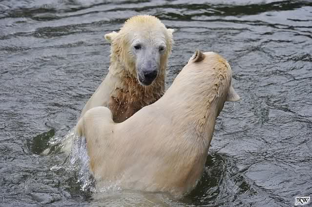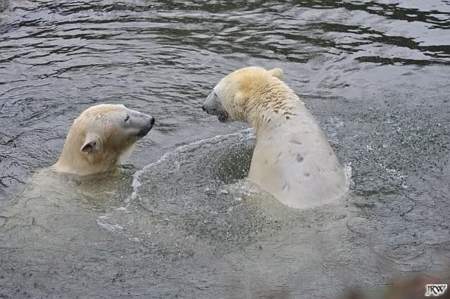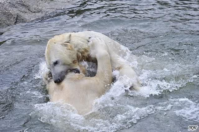 Als Knut genug von der Langeweile hatte, paddelte er wieder wie wild im Wasser. Nach einiger Zeit hatte er auch Erfolg und Tosca kam. Es folgten wieder wilde Wasserspiele, wobei Tosca teilweise ganz schön grob war. Irgendwann war es Knut zuviel und er ging auf die Insel. Tosca folgte ihm, sprang aber dann doch lieber wieder runter. Später spielten sie aber doch wieder gemeinsam im Wasser.