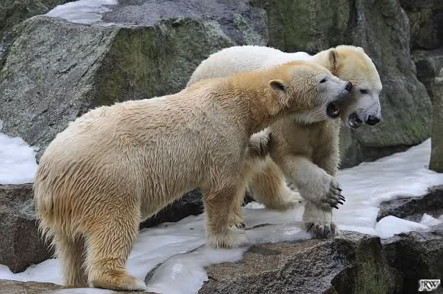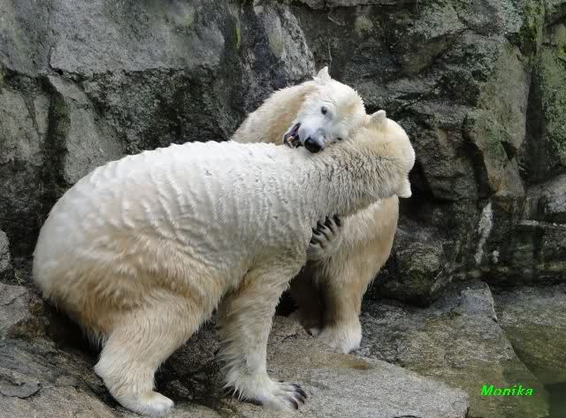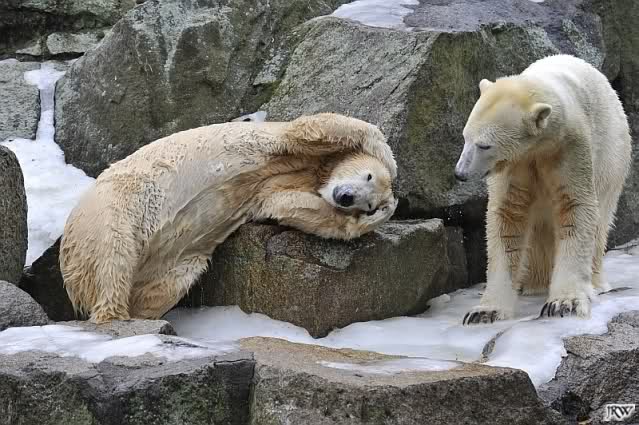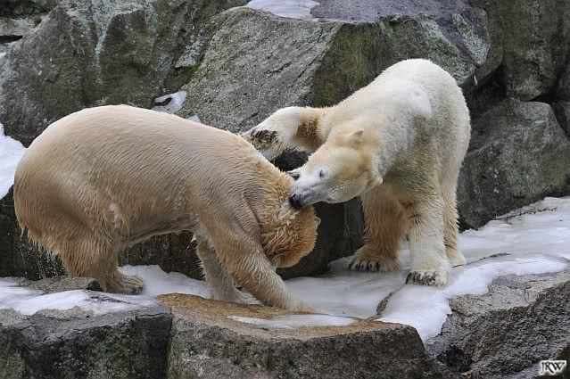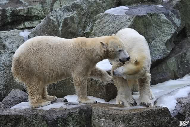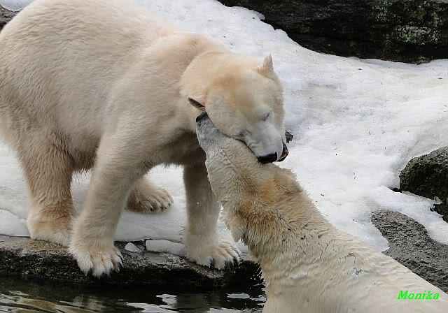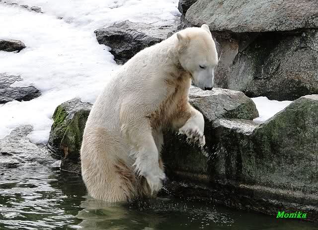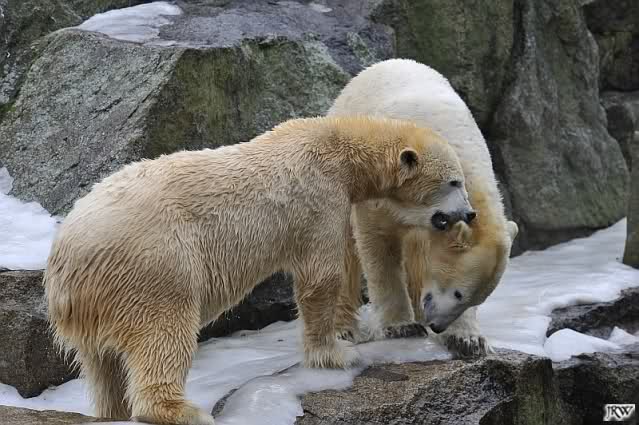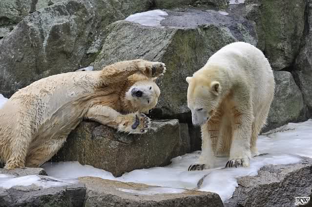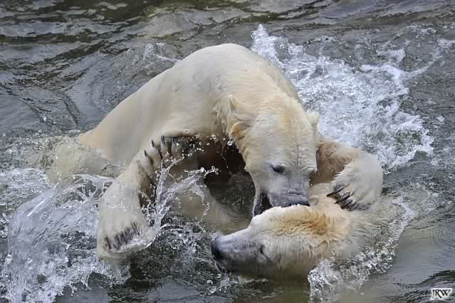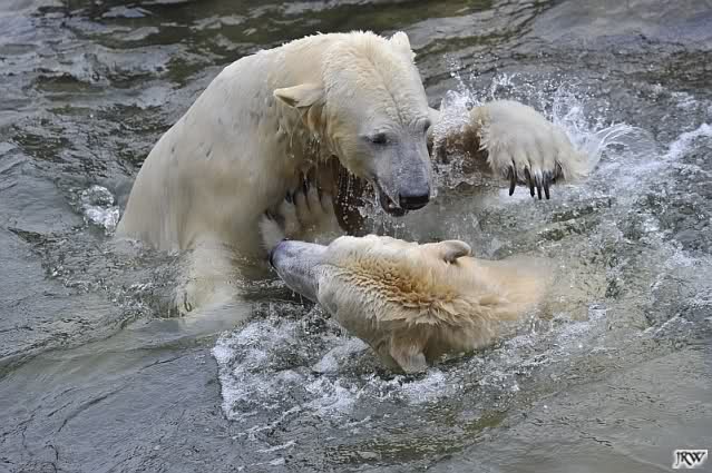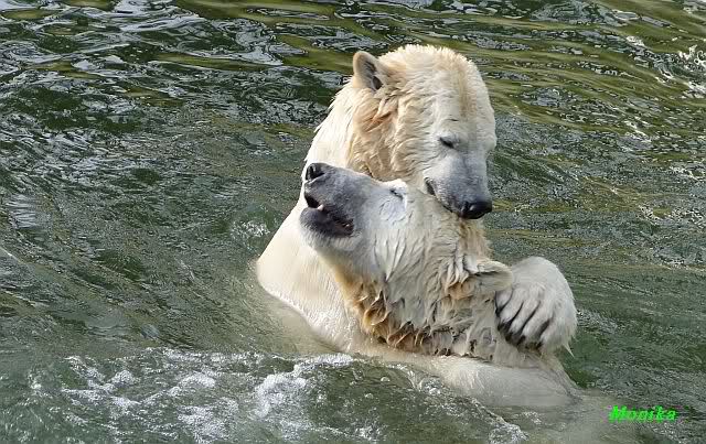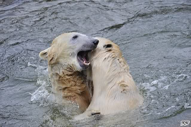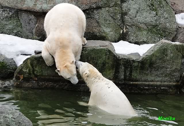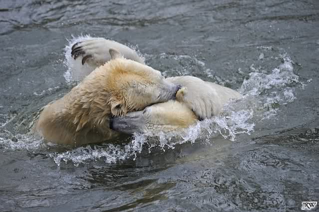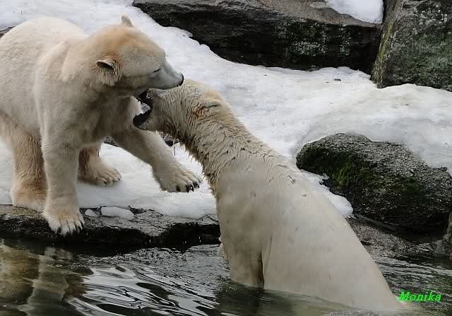 Als Knut genug von der Langeweile hatte, paddelte er wieder wie wild im Wasser. Nach einiger Zeit hatte er auch Erfolg und Tosca kam. Es folgten wieder wilde Wasserspiele, wobei Tosca teilweise ganz schön grob war. Irgendwann war es Knut zuviel und er ging auf die Insel. Tosca folgte ihm, sprang aber dann doch lieber wieder runter. Später spielten sie aber doch wieder gemeinsam im Wasser.