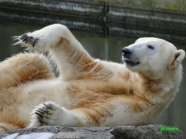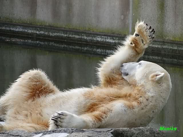 Wenn ich Doris und Jessies Fotos von gestern betrachte, war mir fast klar, dass sich die Bären wahrscheinlich erst einmal ausruhen müssen. So wurde es auch ein ruhiger Vormittag. Nancy ging zu Tosca in die Höhle und Knut auf seine Ecke. Aber so richtig müde war er eigentlich nicht. Er widmete sich der Fellpflege und machte Stretching.