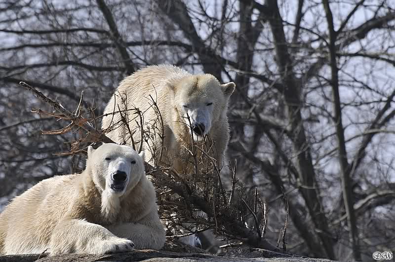 Nach der Fütterung legte sich Knut in seine Ecke. Tosca und Nancy beschäftigten sich abwechselnd mit der Baumkrücke.