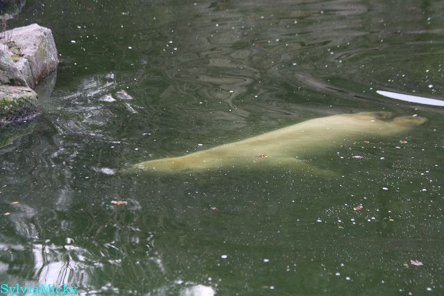 Nach einer Weile stand er auf und ging die Anlage runter und schwamm zur linken Insel und legte sich hin.
