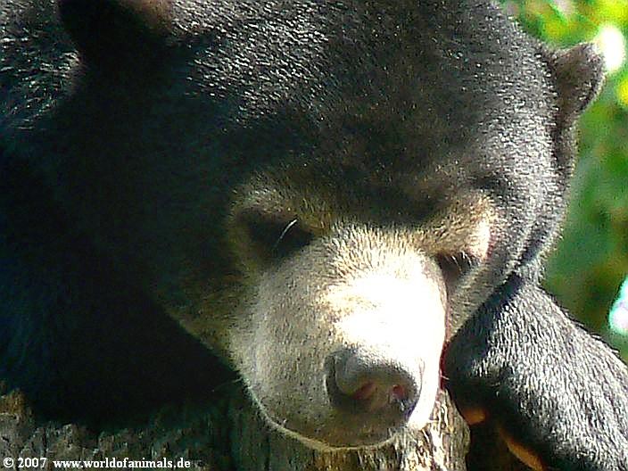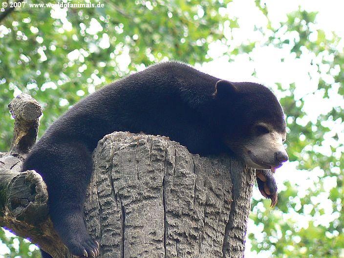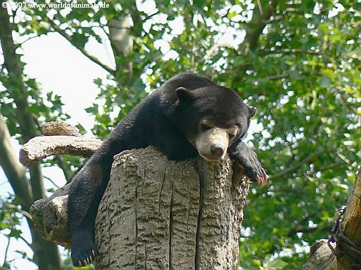 Während sich nebenan die Besucher an der kleinen Eisbäranlage drängeln um Knut zu sehen, stehen bei Ernst, dem kleinen Malaienbär, nur ganz wenige oder garkeine Besucher. Er hat sich aber auch verkrümelt: Auf die Spitze des Baumstammes, dem höchsten Platz der Anlage...