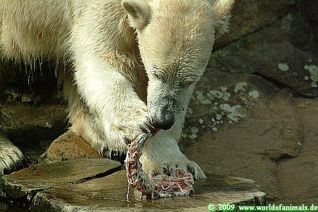 Nun zum heutigen Sonntag Nachmittag: Knut wurde von einer jungen Tierpflegerin gefüttert, erhielt eine gute Ration Futter, die aus Fisch, Weintrauben, Obst, Fleisch und einem Ochsenschwanz bestand.