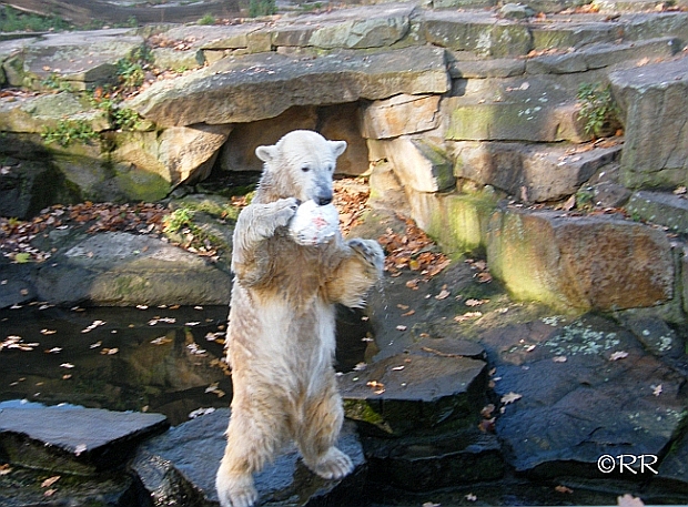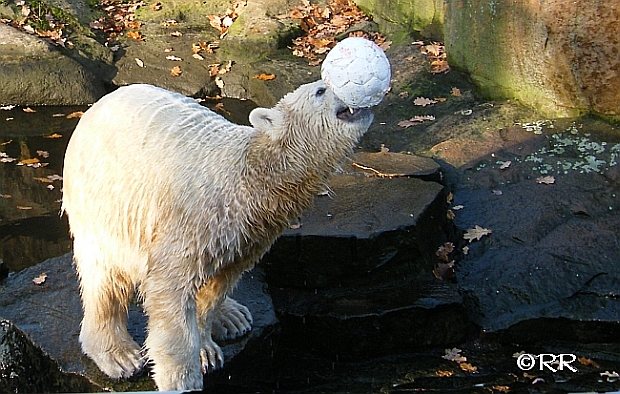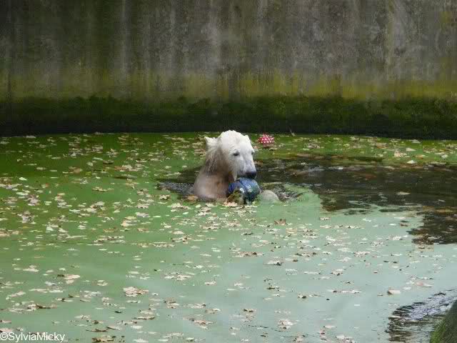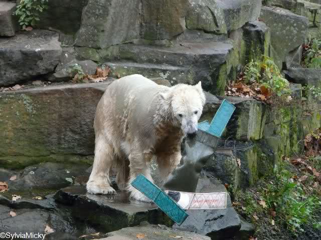 Good evening to you all Knut friends around the world. First thanks to all the pictures, collages and informations today. We can see that Knut is in a good mood. He love to play with his visitors.