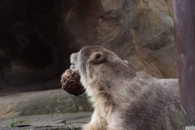 Knut hatte heute wieder einen guten Tag. Die Knutians brachten wieder ein Ladung Leckereien für die Bären und Knut soll begeistert gefuttert haben. Besonders interessant für ihn war eine Kugel aus Naturfasern (Wasserhyazinthe). Er kam immer wieder zu seinem neuen Spielzeug und obwohl er schon ungeheuer müde war, konnte er die Tatzen nicht davon lassen. Die Zähne übrigens auch nicht. Offensichtlich hatten wir den schneeweißen Knut um wenige Minuten verpasst. Nun war er in Tarnfarbe, aber trotzdem süß wie immer.