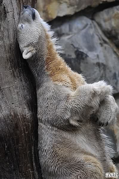 "Einmal fürchtete er (Knut) sich vorm Wind draußen. Er hörte das Rauschen, spitzte die Lippen und prustete - TYPISCHE REAKTION EINES EISBÄREN, WENN ER SICH BEDRÄNGT FÜHLT."